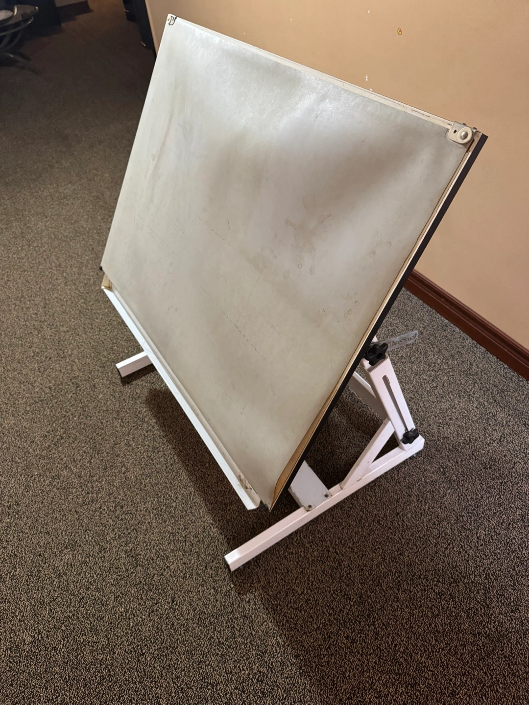 Selling a drafting table in used condition. The height is adjustable, making it versatile for different projects. There are some signs of wear and use on the surface, but it's still functional for drafting, drawing, or other creative tasks. Does not come with ruler.