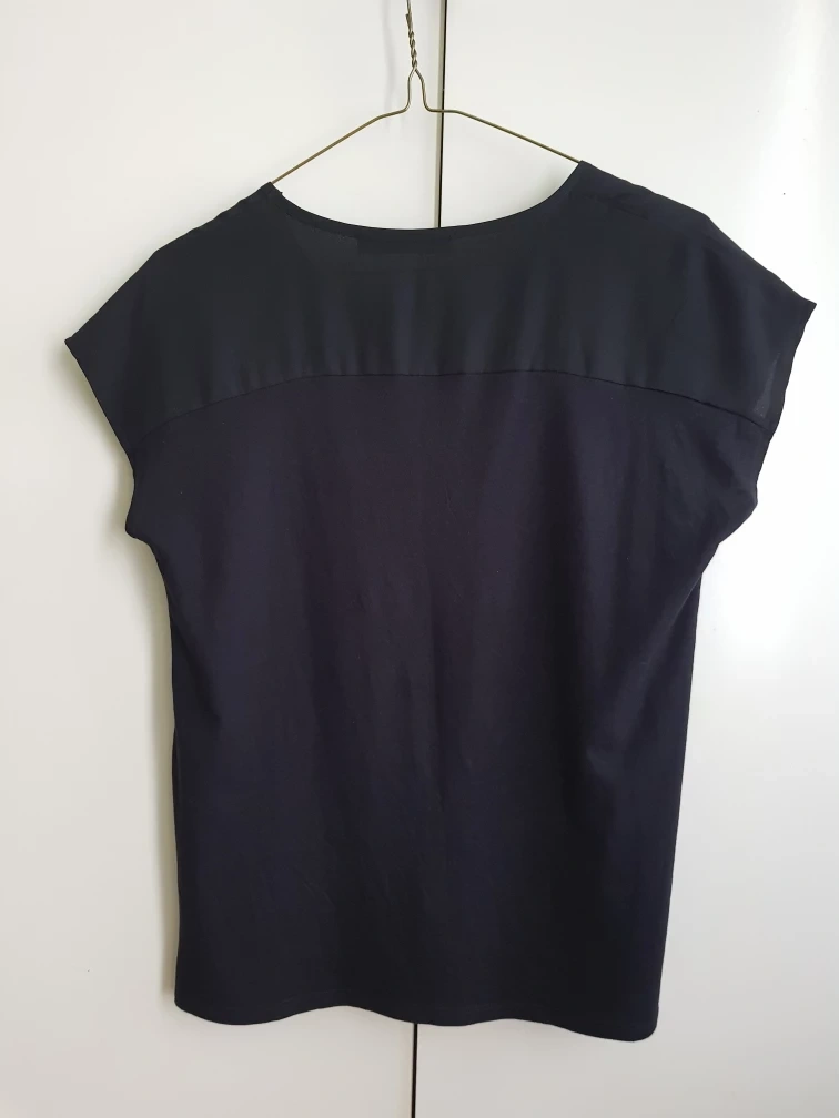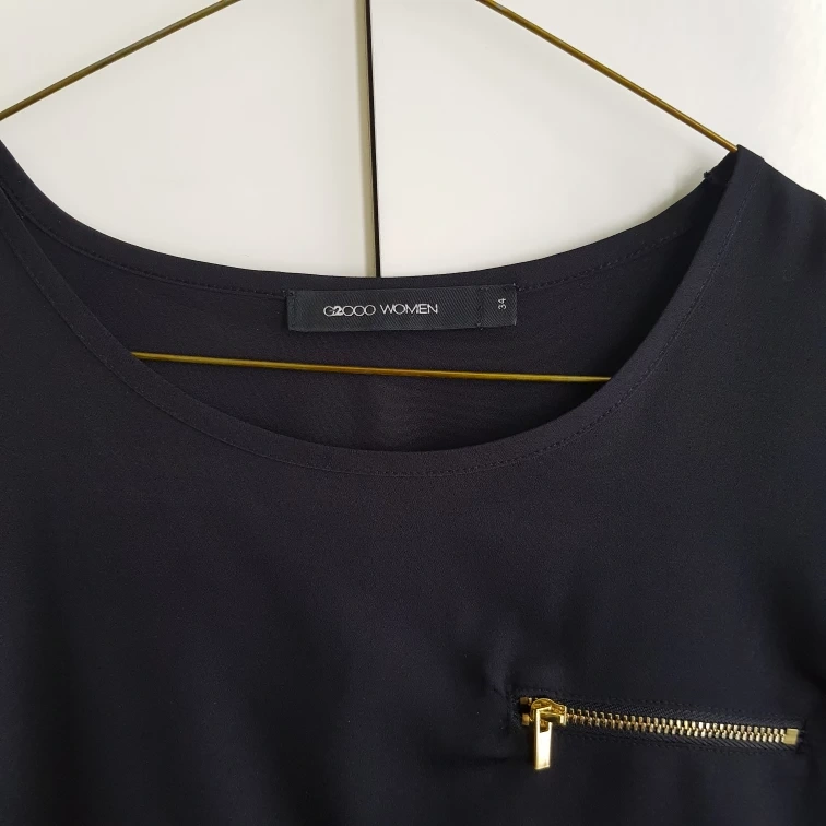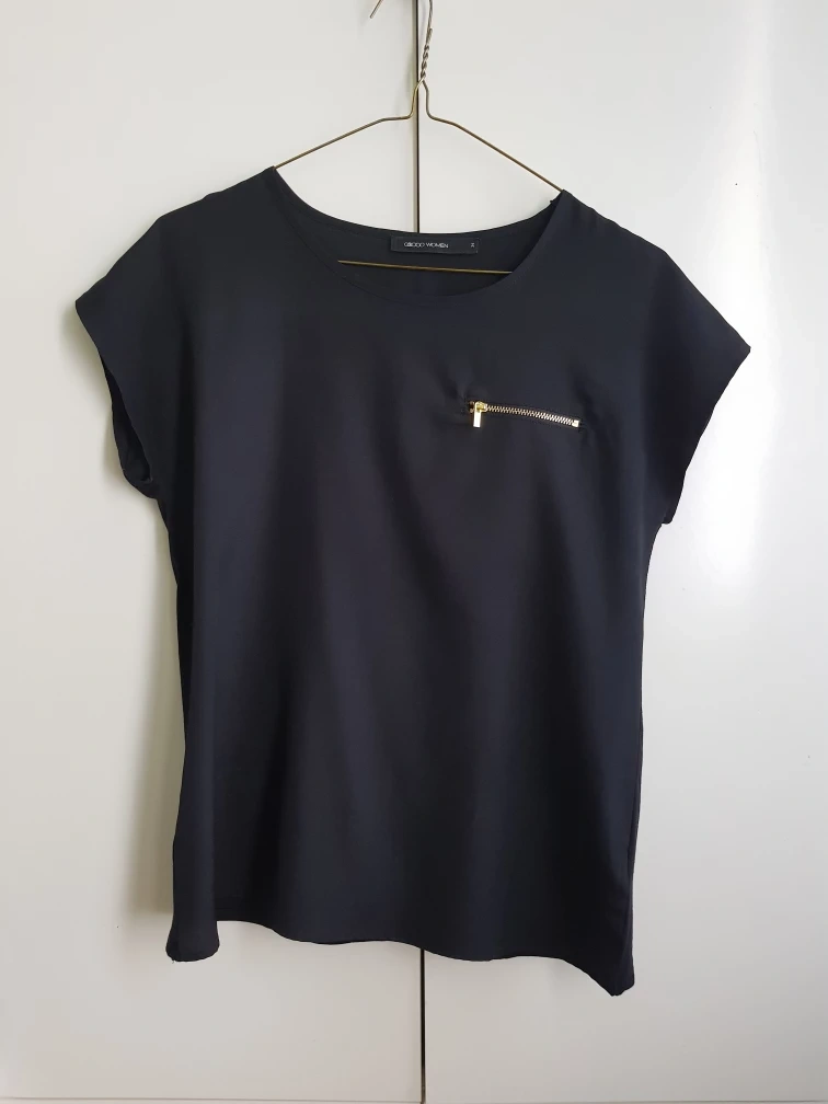 Here's a gently used black top from G2000 Women! It's a size small and features a stylish design with a small zipper detail on the front.