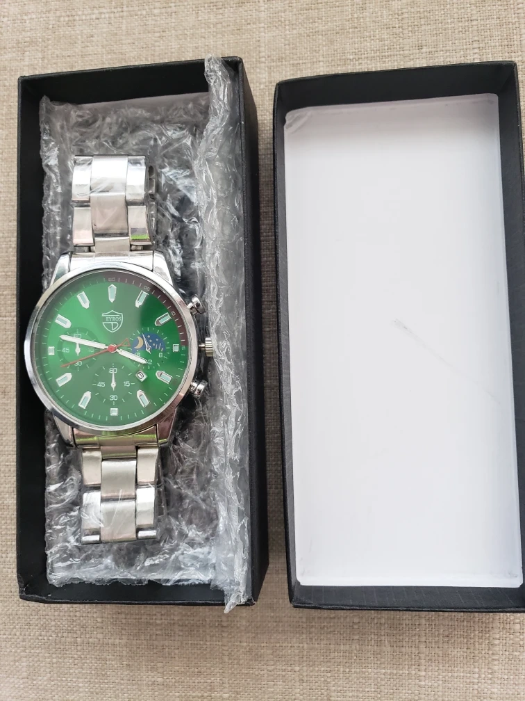 Selling an Eyros men's watch with a striking green dial! It comes complete with its original box, making it a great find for anyone looking for a stylish timepiece