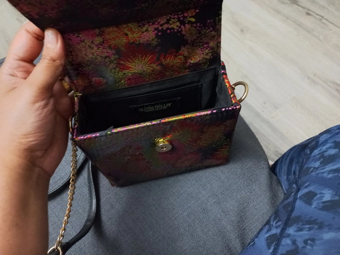 Super cute Olivia Miller cube-shaped crossbody bag! It features a beautiful floral pattern with a gold-tone chain and a black shoulder strap. Perfect for adding a pop of colour to any outfit
