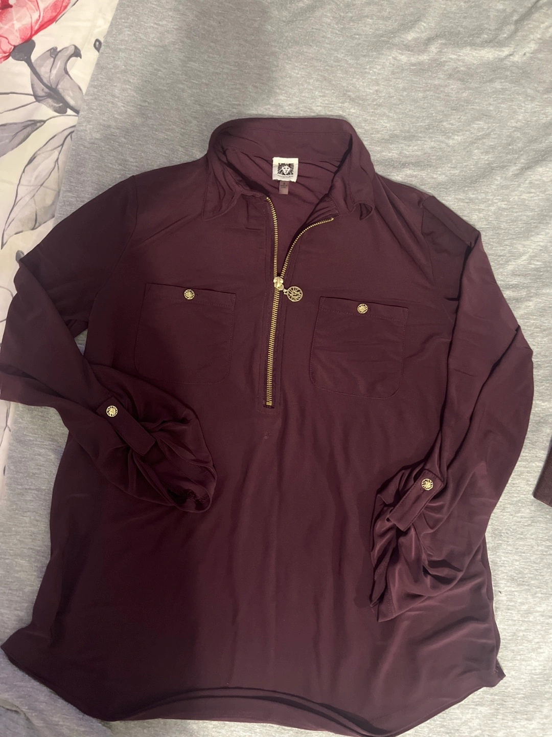 Selling an Anne Klein blouse in a lovely burgundy colour! It features a stylish quarter-zip design and roll-tab sleeves. This blouse is in great condition and would make a versatile addition to your wardrobe