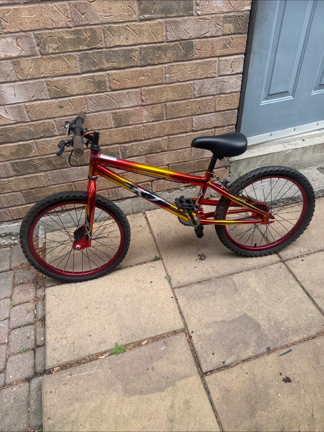 Giving away a kids' bike with a vibrant red and gold colour scheme. It's in good condition and ready for a new rider! Needs a new tube in the front tire and a brake calliper!