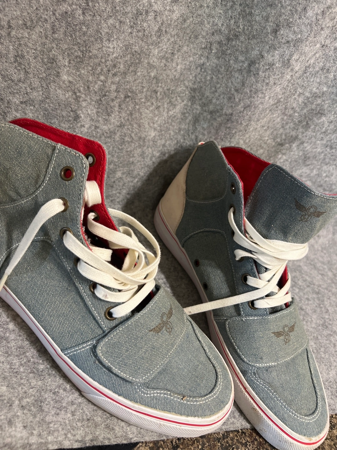 Selling a pair of Creative Recreation high-top sneakers in US size 10. These sneakers feature a unique design with a grey denim-like material and off-white suede accents. The soles are red, adding a pop of colour!