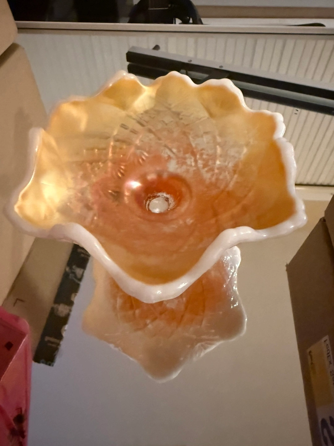Here's a lovely vintage Fenton carnival glass bowl! It has a beautiful iridescent sheen and a delicate, ruffled edge. Perfect for adding a touch of vintage charm to your home decor!