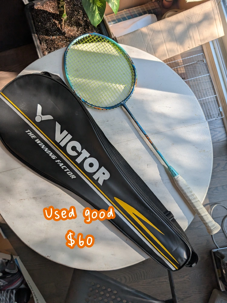 Selling a Victor badminton racket in used but good condition. It comes with a case to keep it protected when you're not playing. Perfect for anyone looking to get into badminton or upgrade their current racket!