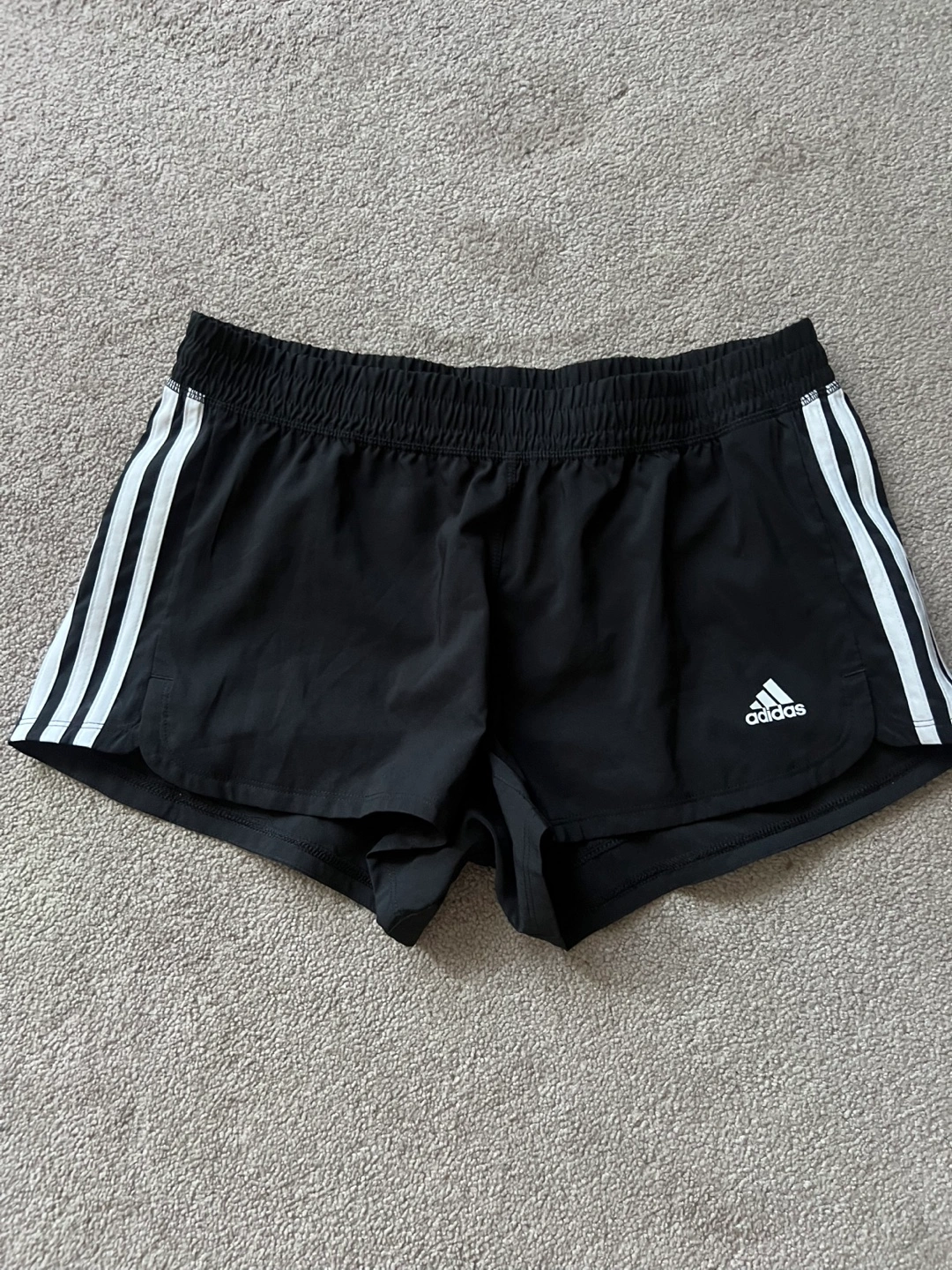 Adidas Climalite running shorts in size medium. They are black with the classic white Adidas stripes on the sides. Made in Cambodia, these shorts are designed with Climalite fabric to keep you cool and dry during your runs!