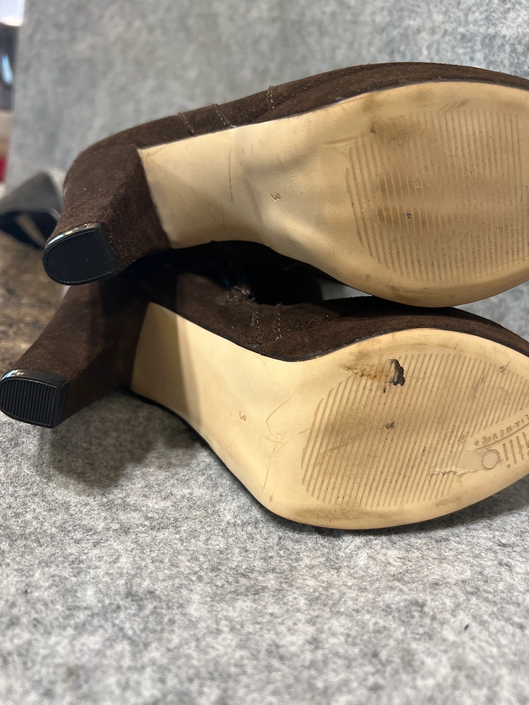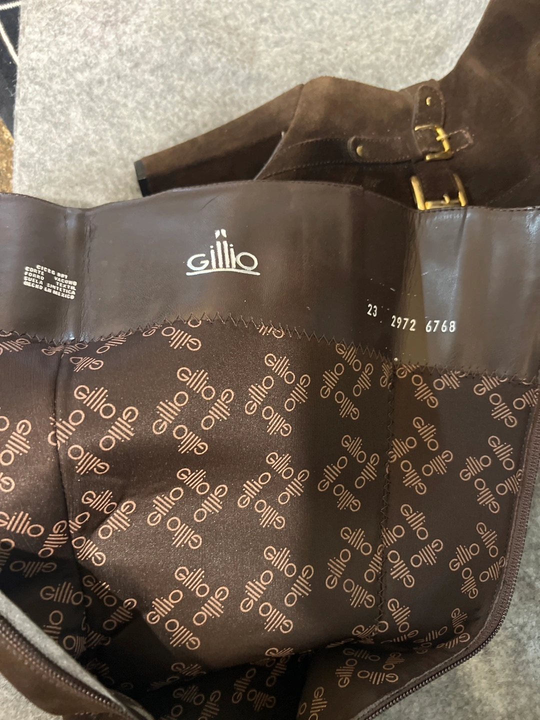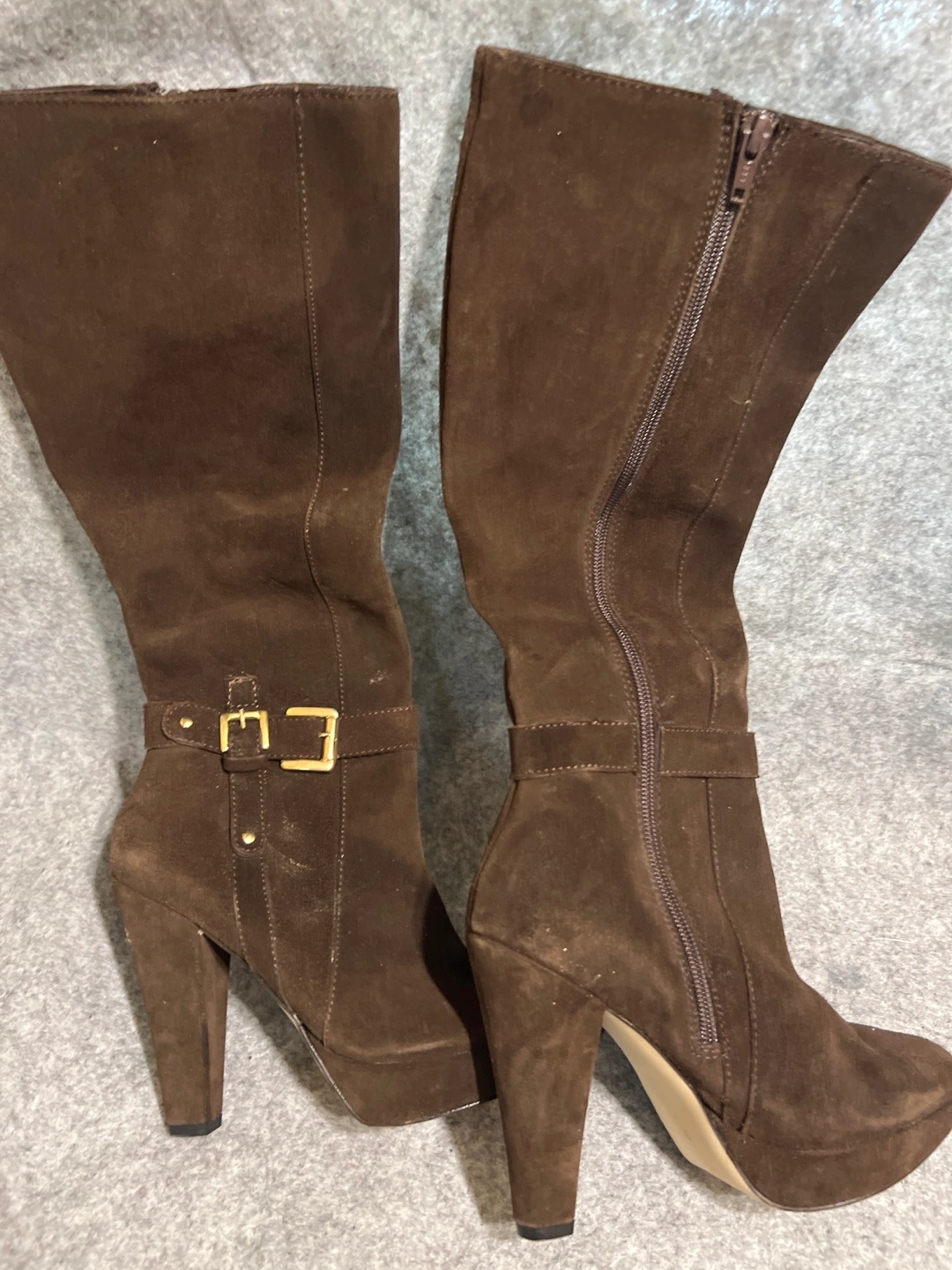 Selling a pair of Gilio knee-high boots in brown suede. They feature a stylish buckle detail and a comfortable heel. Size 6. No sole wear.