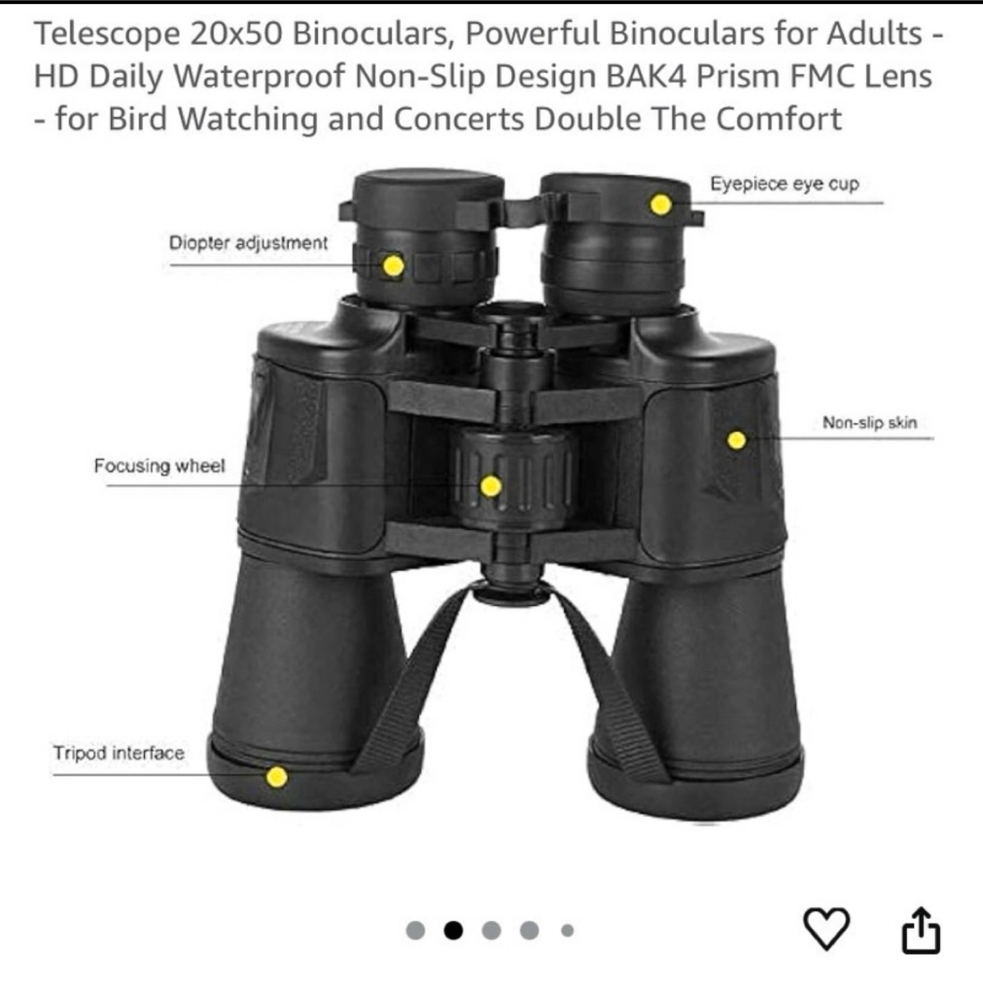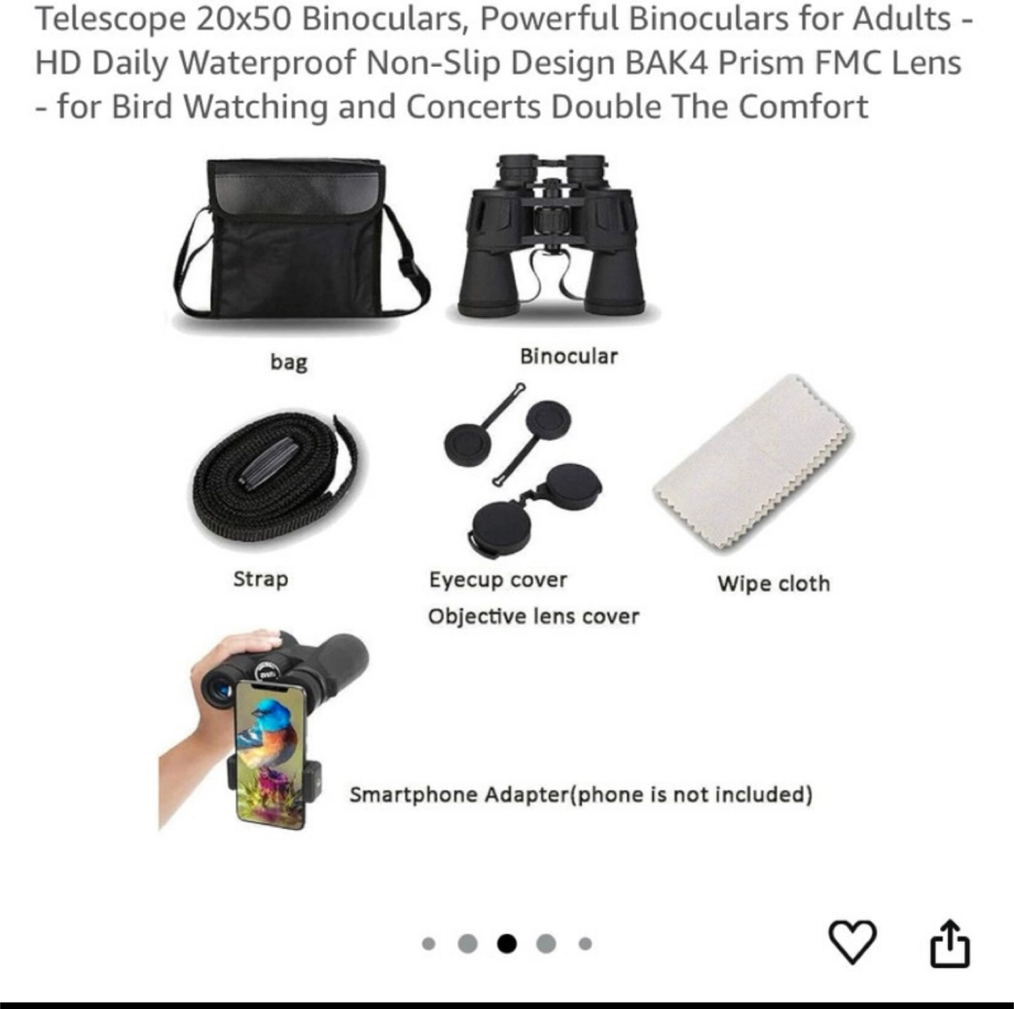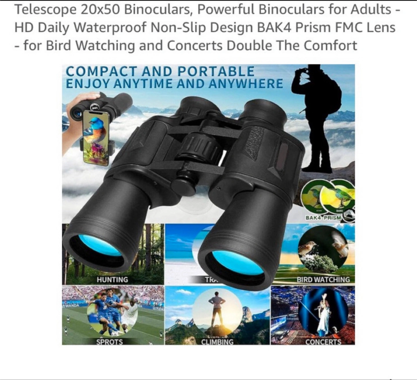 These 20x50 binoculars are perfect for bird watching, concerts, and more! They feature a HD daily waterproof and non-slip design with BAK4 prism FMC lenses for clear and comfortable viewing. Also included is a smartphone adapter.