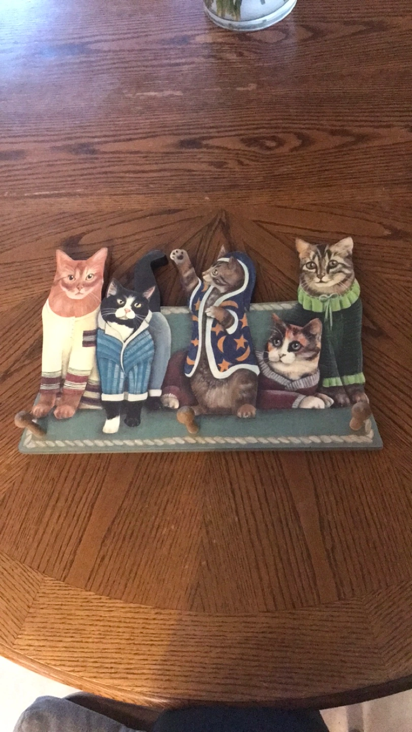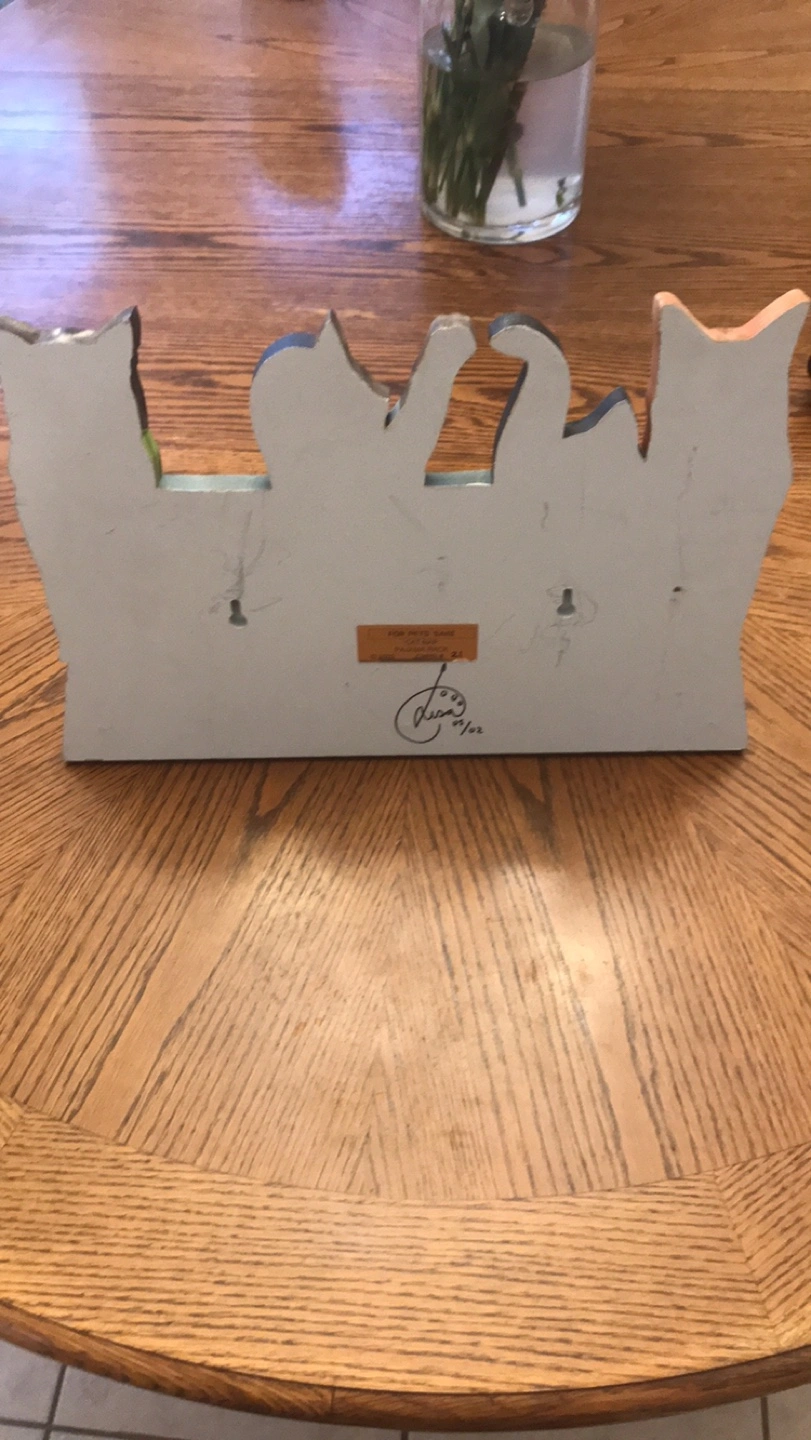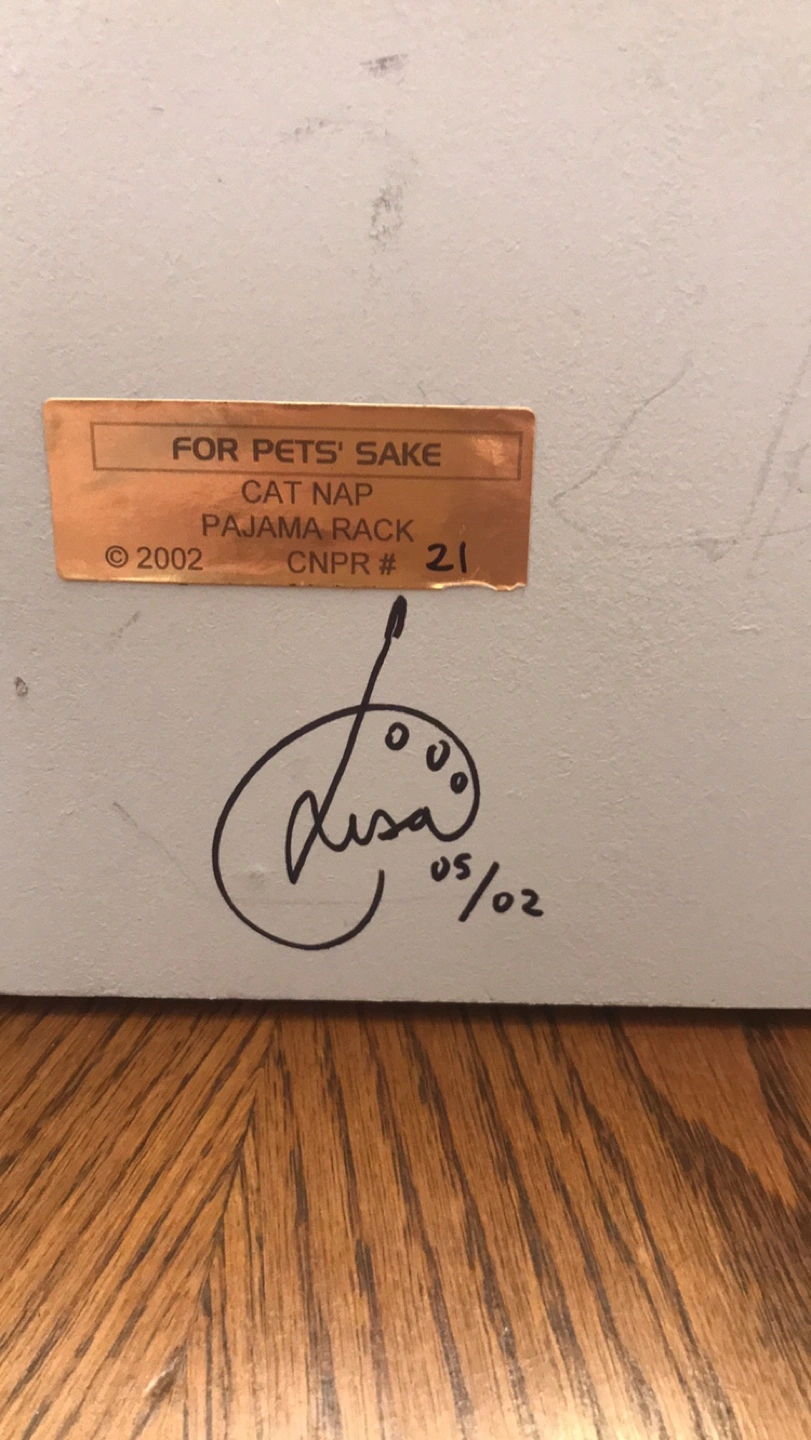 Selling a cute "For Pets' Sake" cat themed pajama rack! This adorable piece features cats dressed in pajamas, adding a whimsical touch to any room. Has a manufacturing date of 2002 May 05