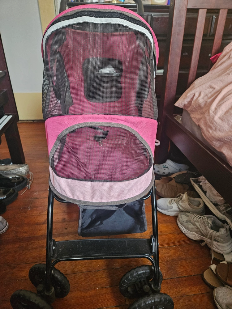 Selling a gently used Pawhut pet stroller in pink! It's perfect for taking your furry friend on walks or errands. The stroller features a mesh window for ventilation and a storage basket underneath for your convenience. It's lightweight and easy to fold for storage. Great for small dogs or cats!