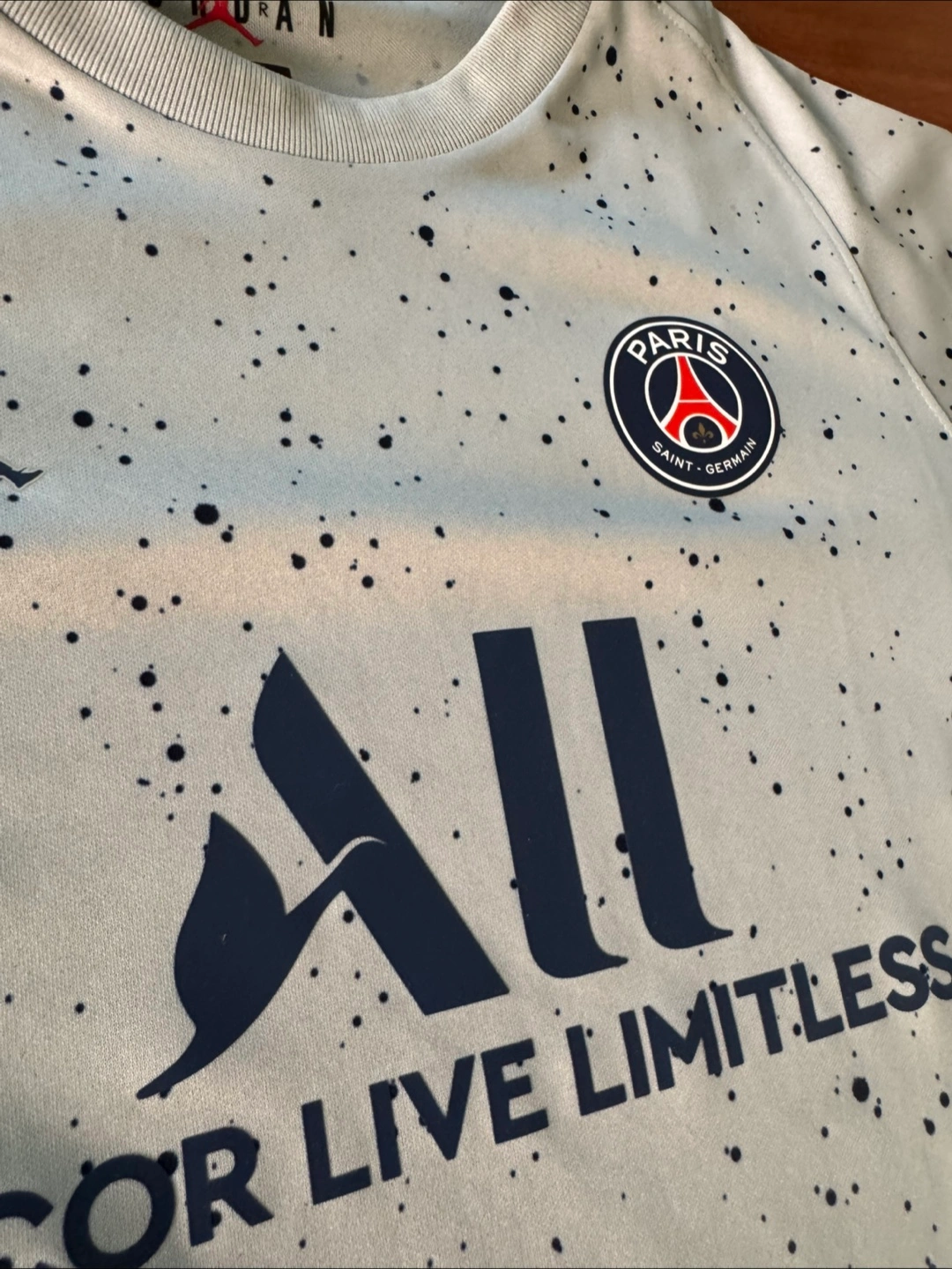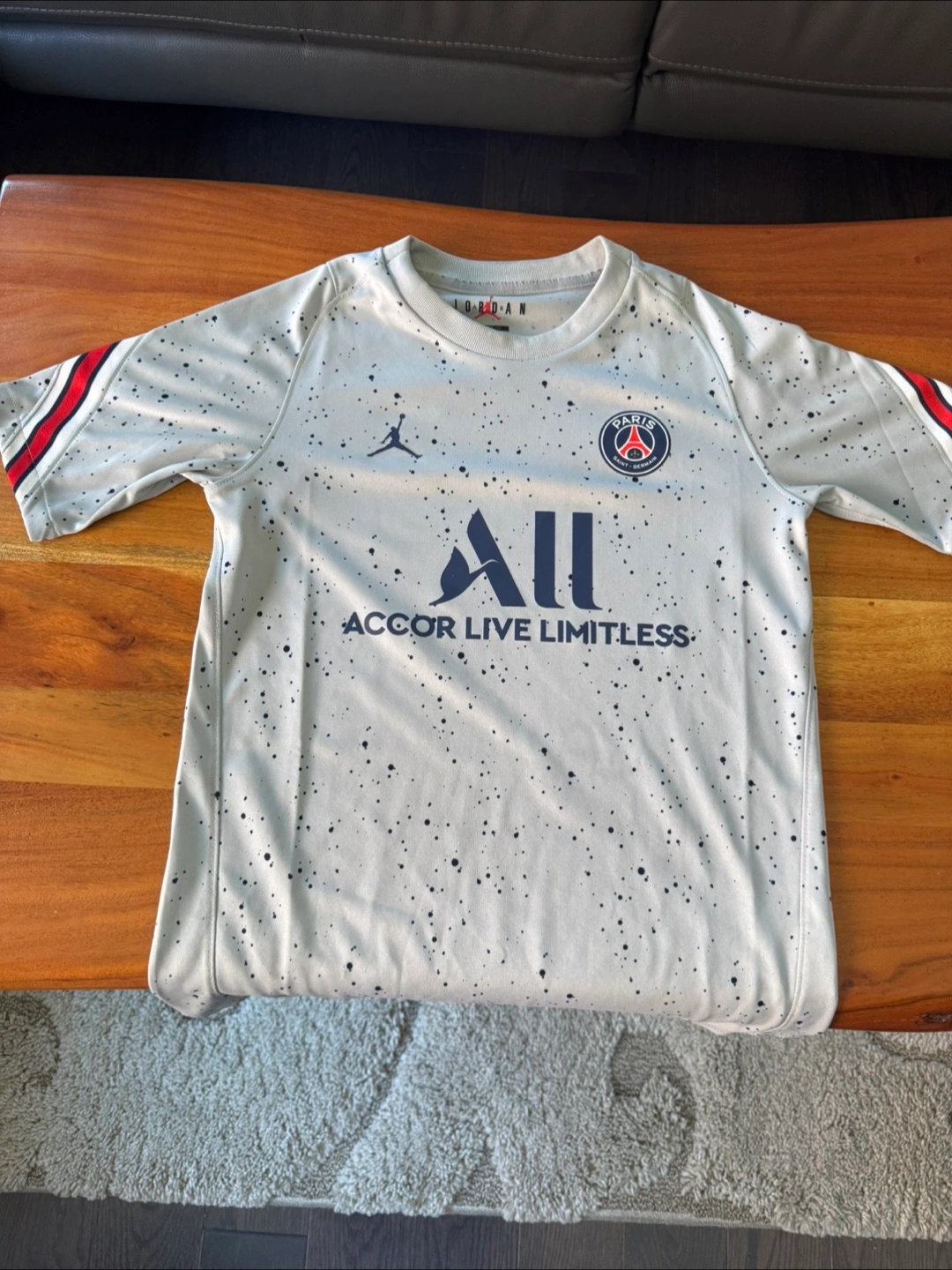 Selling a Jordan x Paris Saint-Germain (PSG) slim fit t-shirt in size large. It's in great condition and features the 'Accor Live Limitless' design