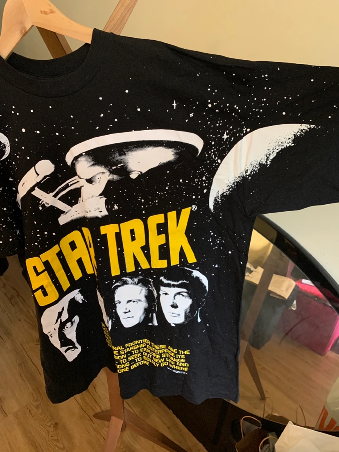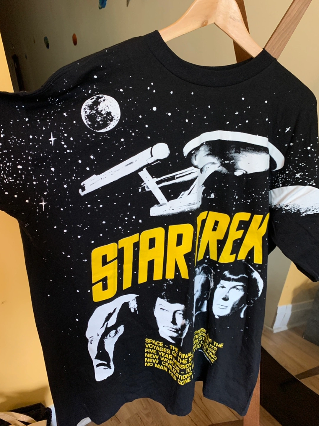 48Selling a Vintage 1990s Star Trek graphic tee in size XL! It features a cool design with the Star Trek Enterprise and the iconic characters, as well as the entire text of the opening sequence. The design is the same on the back, too! Truly a unique piece. The tag indicates it's made of 100% preshrunk cotton, so it should be comfy and easy to care for. Machine wash cool and tumble dry low!