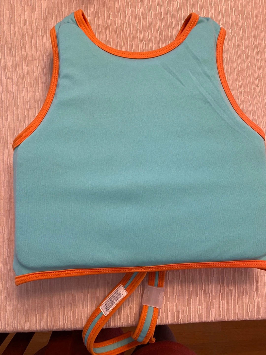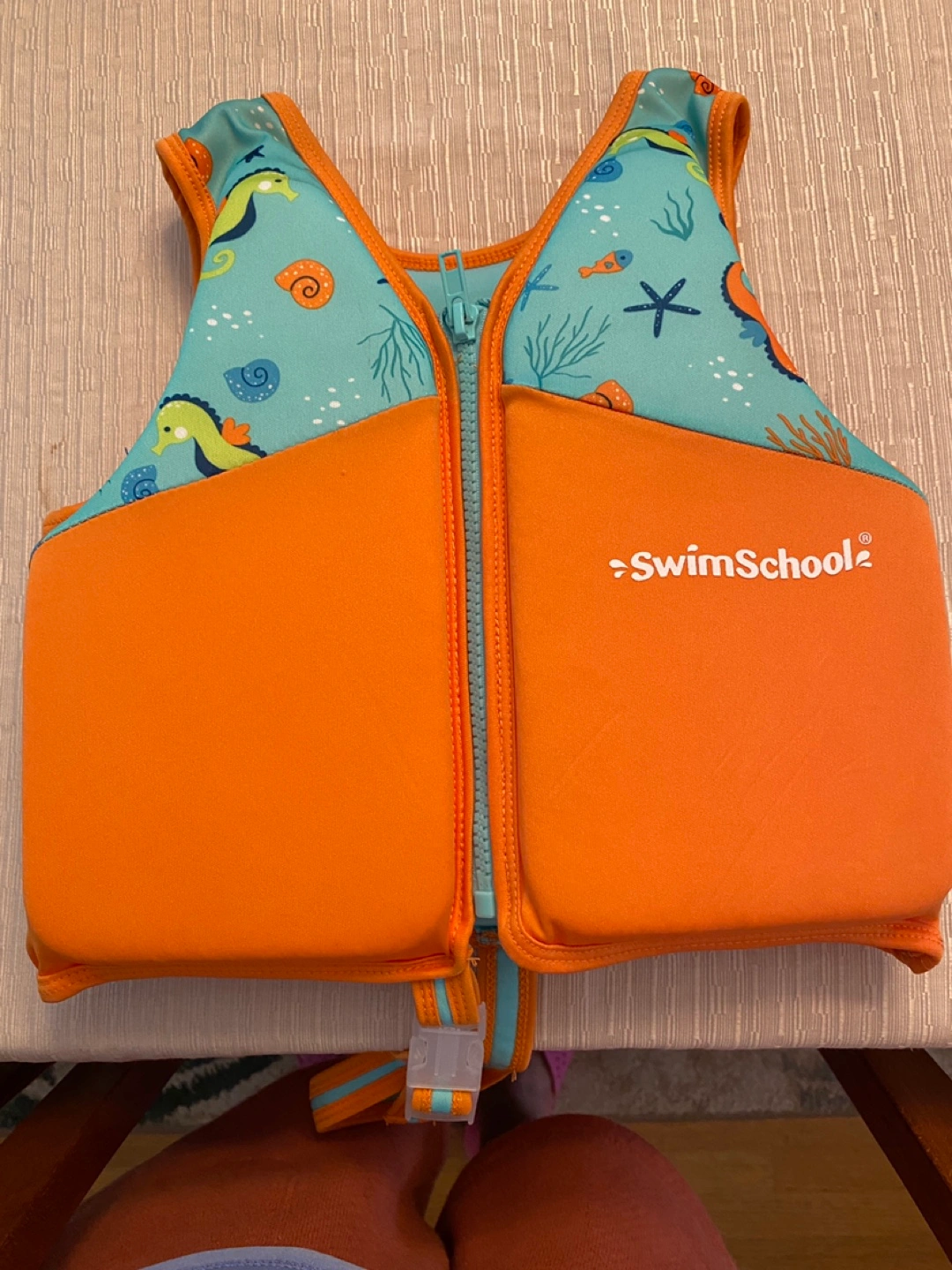 A SwimSchool swim vest for kids! It's in great condition and ready for some fun in the water. The vest features a colourful design with seahorses, starfish, and shells on the upper part, and a bright orange lower section. Perfect for helping your little one learn to swim safely and confidently