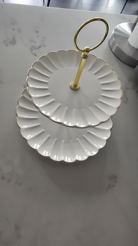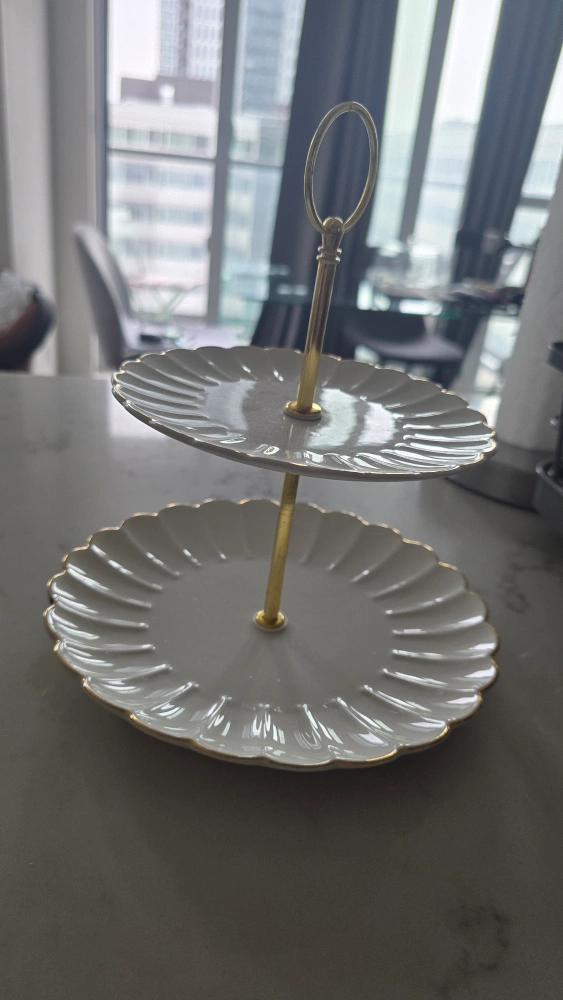 Selling a lovely two-tiered dessert stand! It's perfect for displaying cupcakes, pastries, or other treats. The stand features a white finish with elegant gold accents. It would be a beautiful addition to any kitchen or dining room