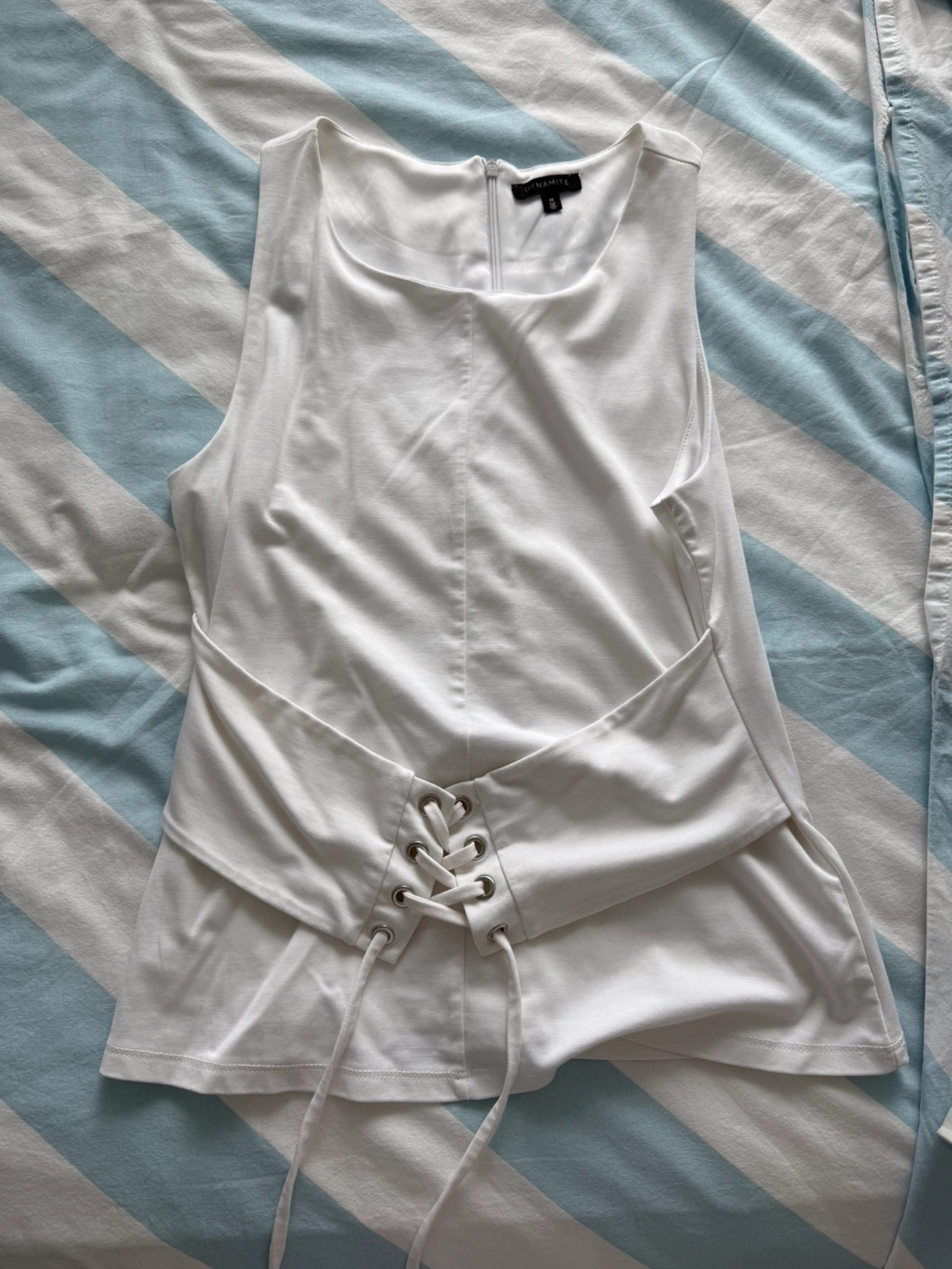 Selling a cute white sleeveless top from Dynamite! It features a unique lace-up detail at the waist, adding a stylish touch. It's in great condition and a size M.