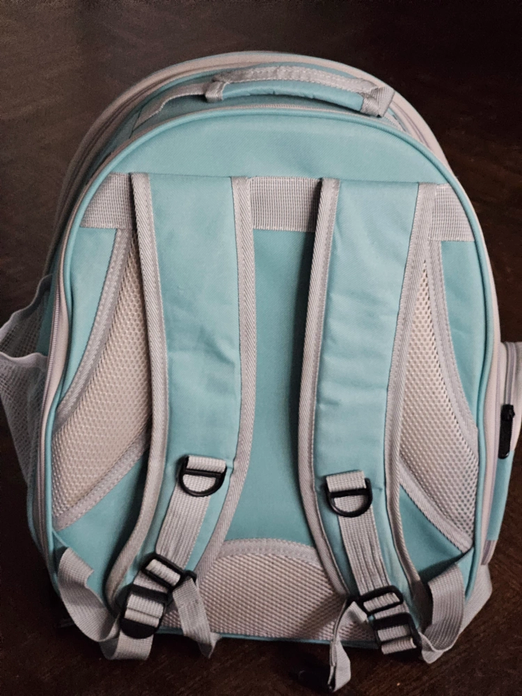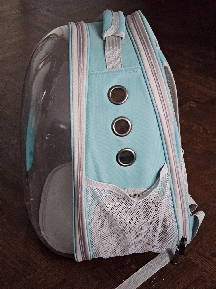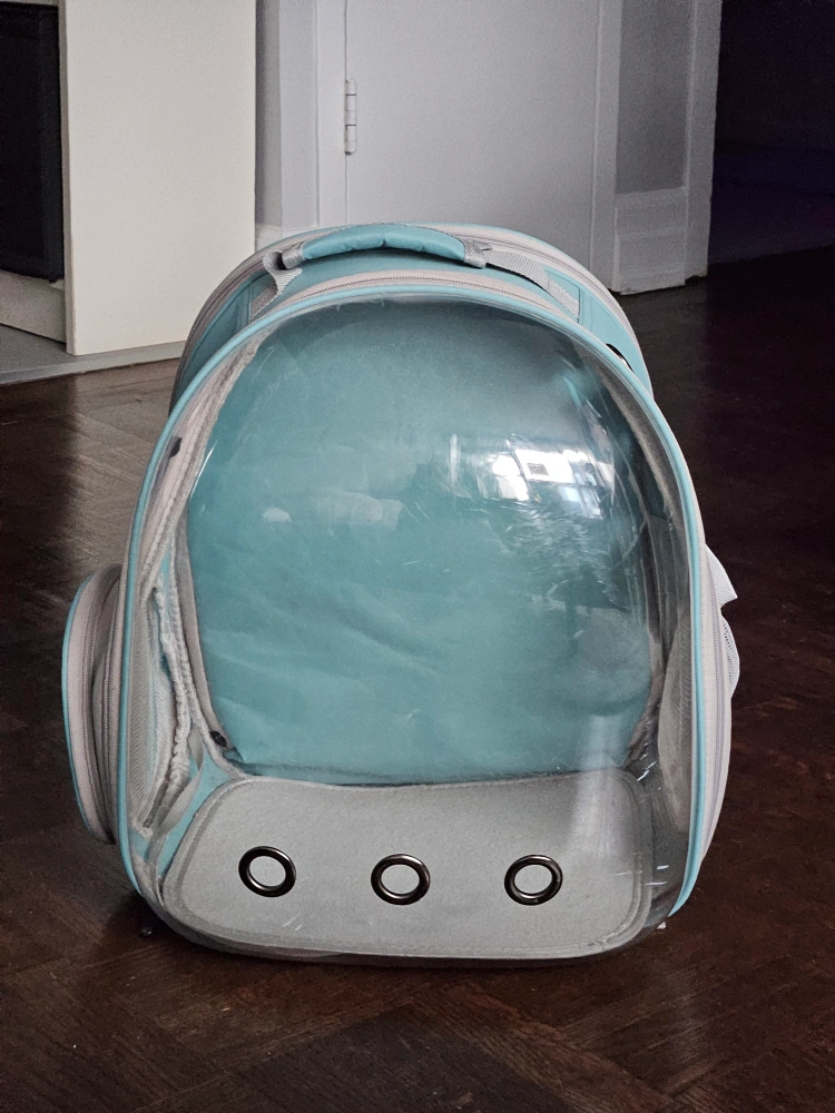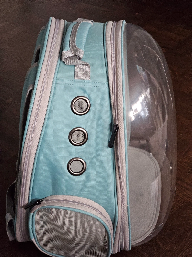 Looking to sell this pet carrier backpack! It's got a cool space capsule design with a clear window so your furry friend can see the world. It's a light blue colour with grey trim. Great for taking your pet on adventures!