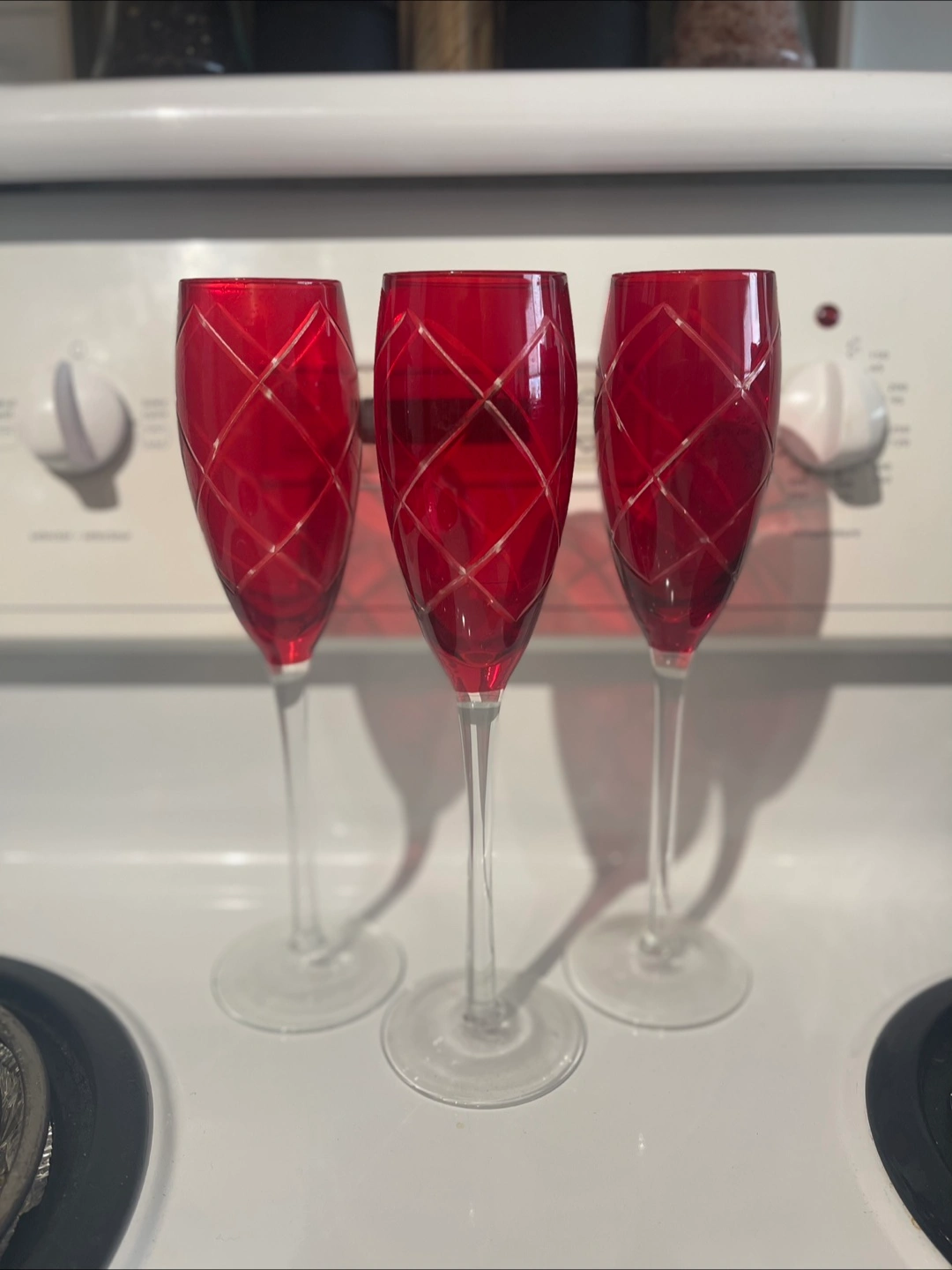 Selling a set of three elegant red champagne flutes. They have a lovely diamond pattern and are perfect for special occasions or adding a pop of colour to your glassware collection