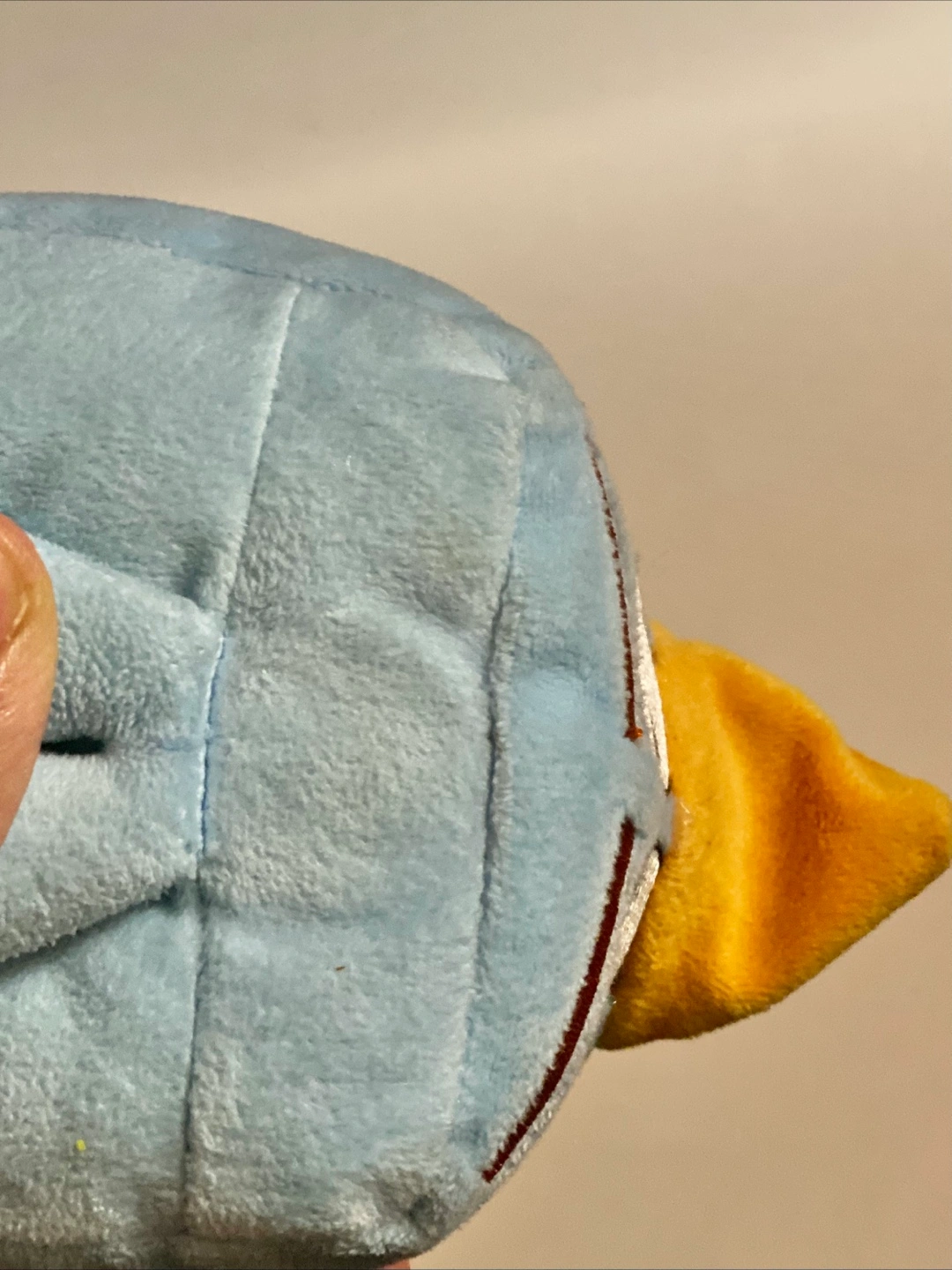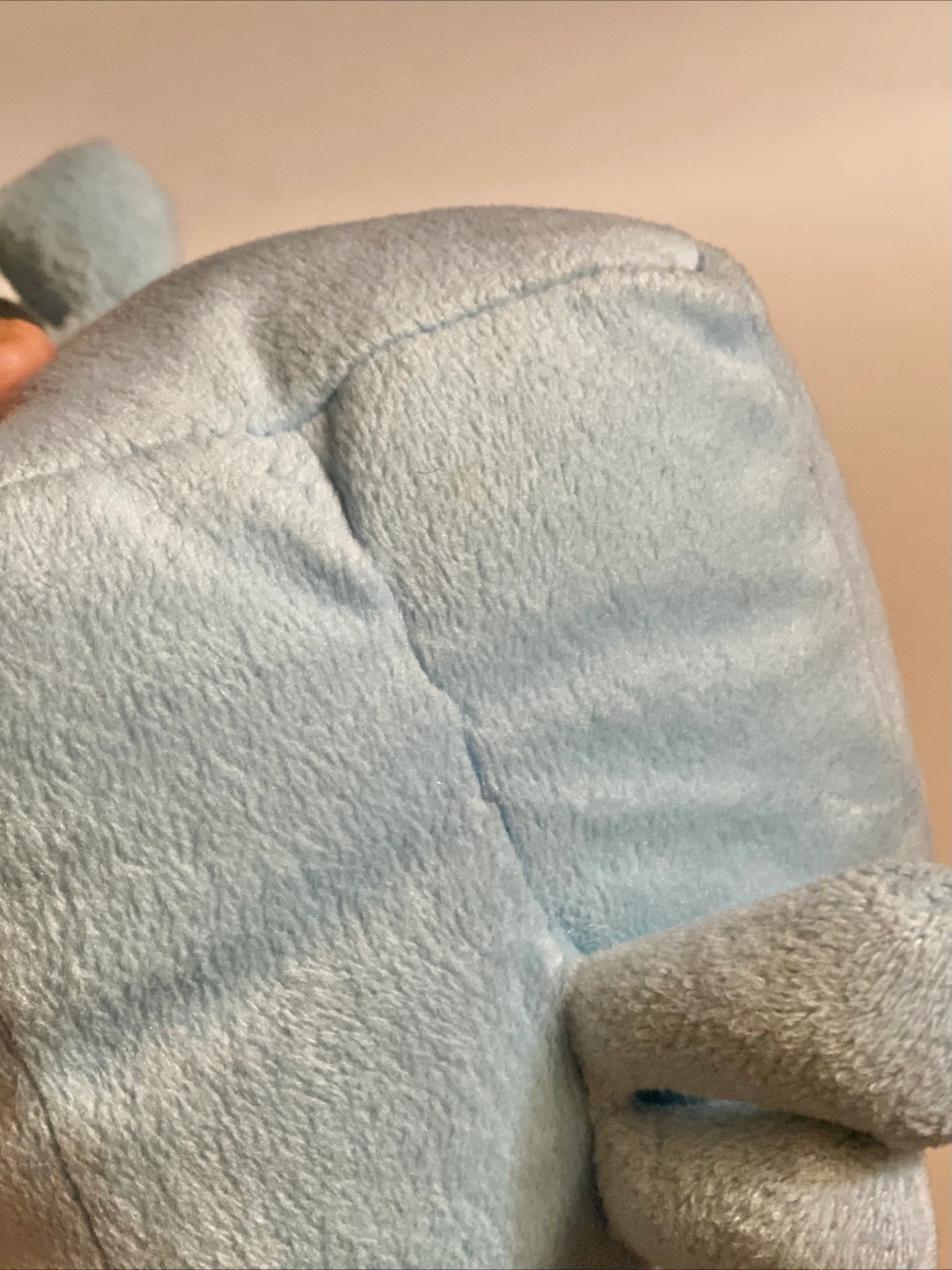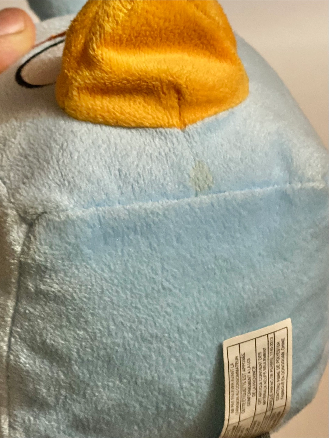 The plush has some light stains to it, looks to have discolored and does not make sounds anymore.