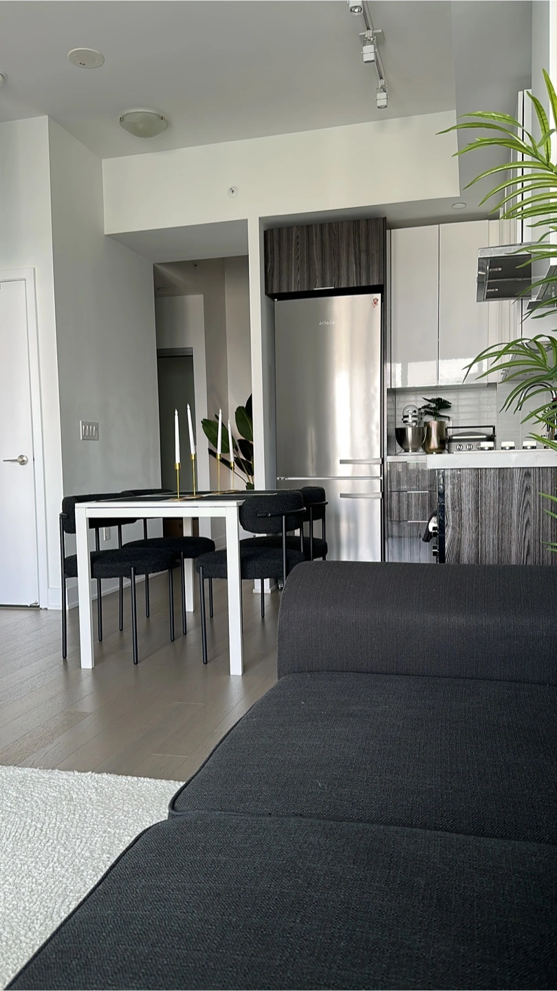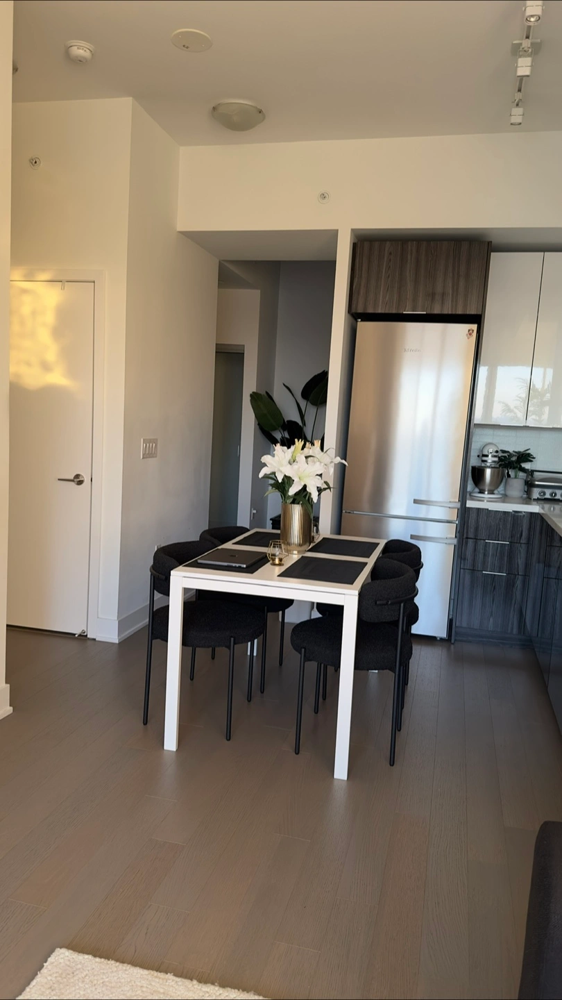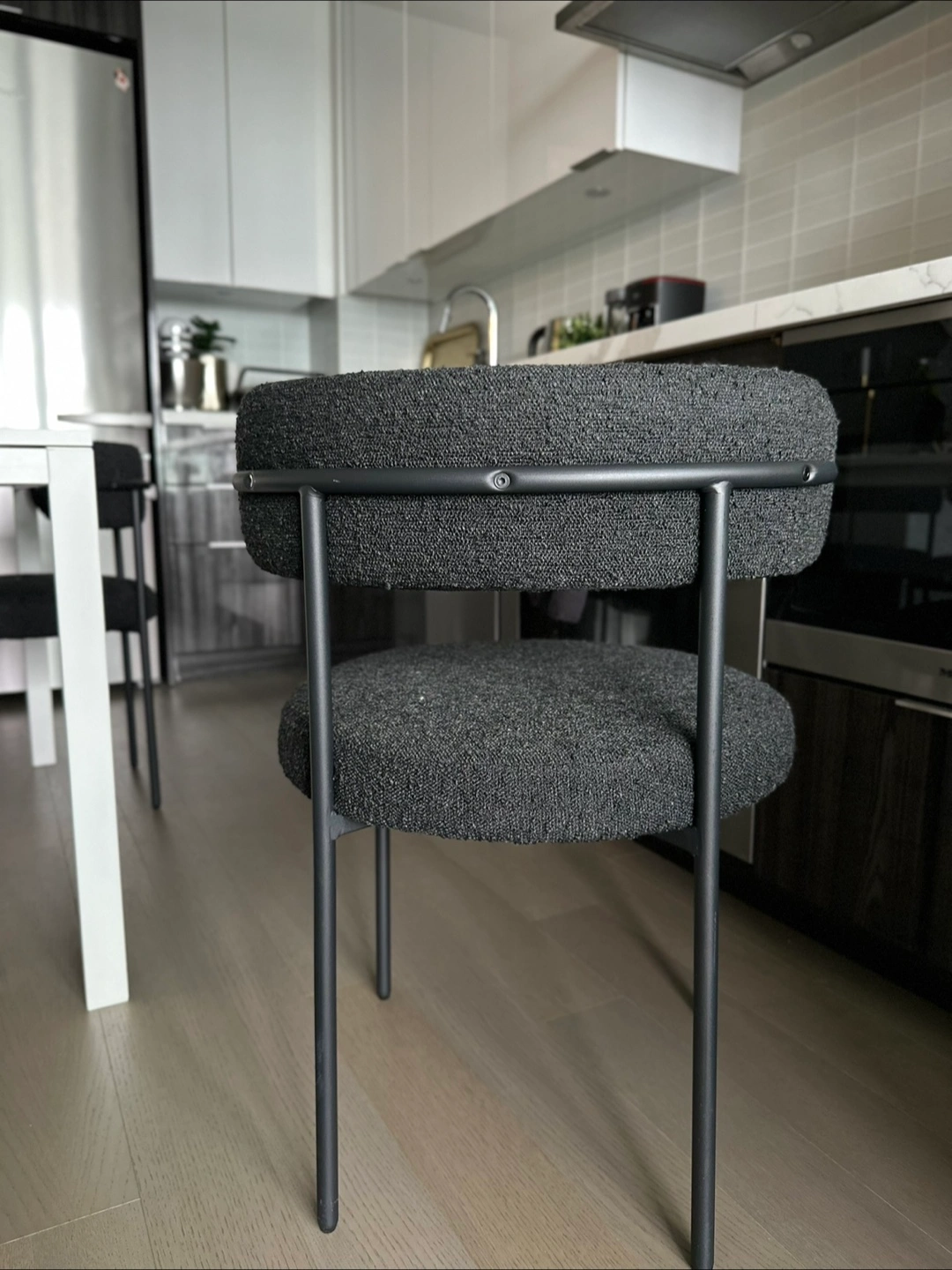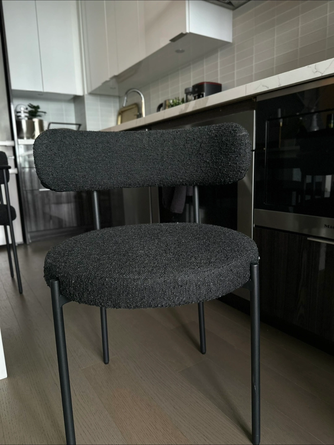 Selling a set of four stylish black dining chairs. They're in great condition and would look lovely in any modern dining space. They have a unique, textured fabric and a sleek, minimalist design. They are sturdy and comfortable for everyday use. Perfect for adding a touch of elegance to your home!
