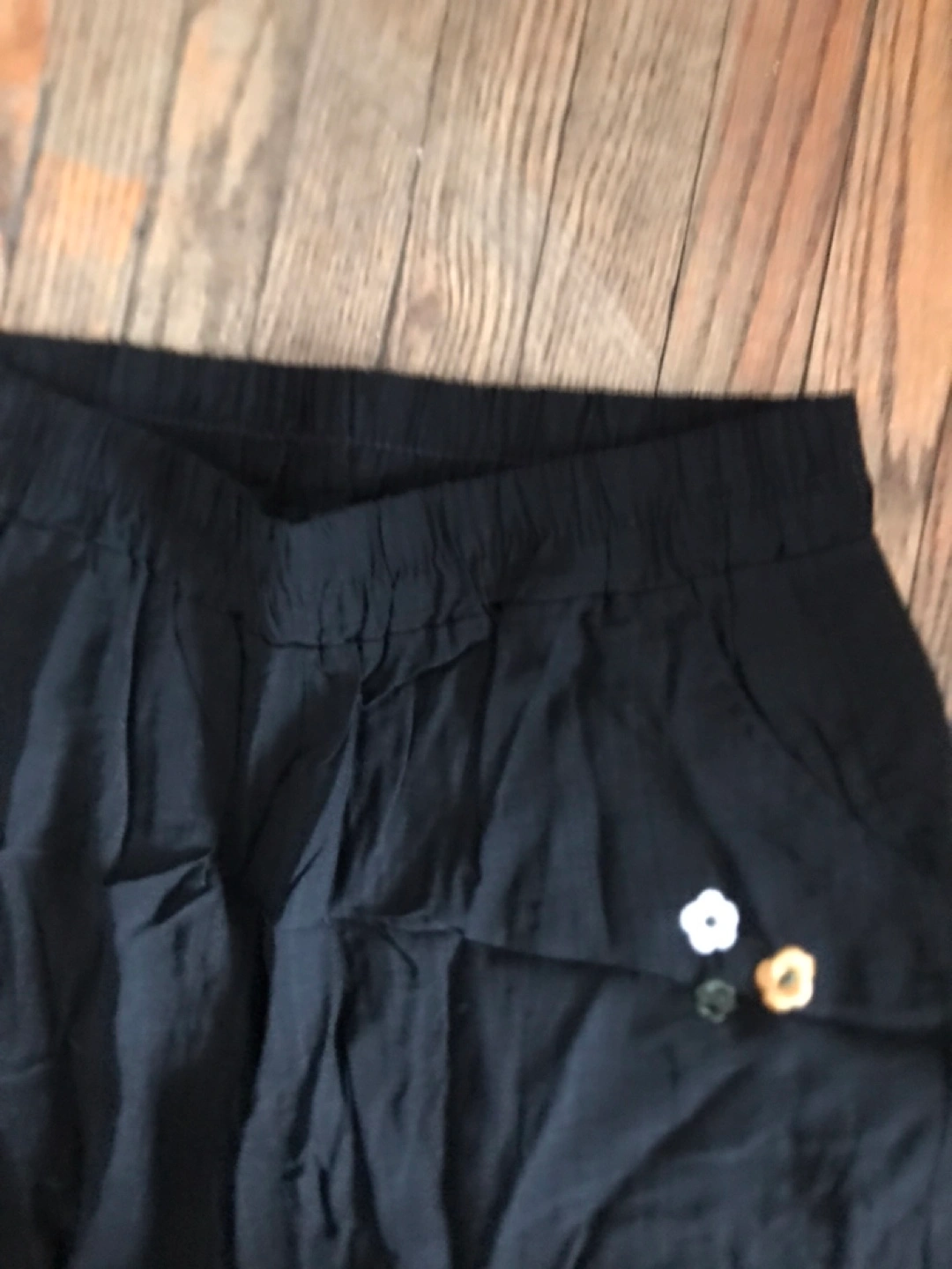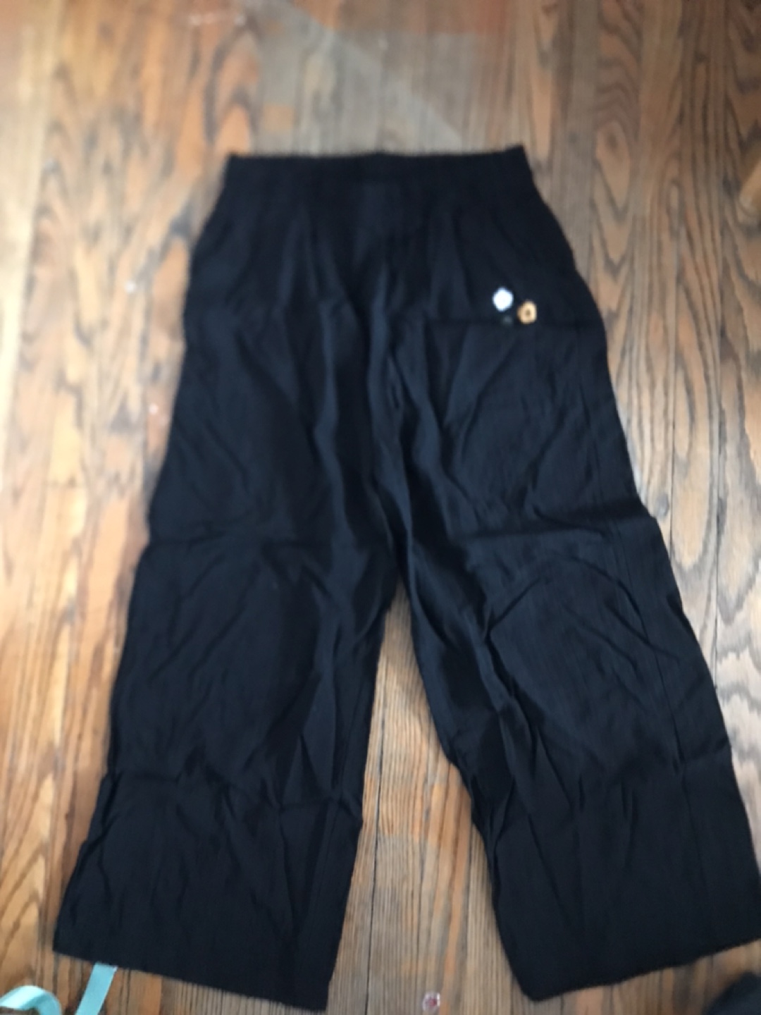 Perfect pants for summer! Size small/medium, never worn, cool flowy black fabric with the cutest embroidery.