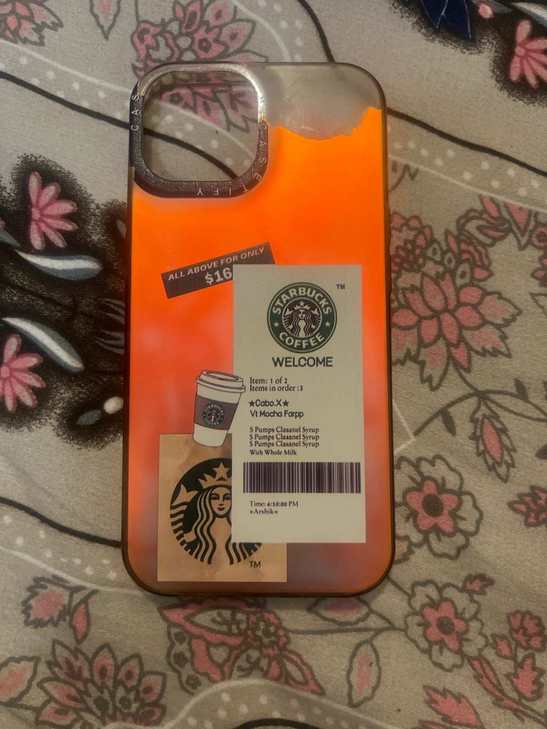 Selling a Casetify iPhone case with a Starbucks design! The case features a fun Starbucks theme with a Frappuccino order detail. Slightly peeled on the top.
