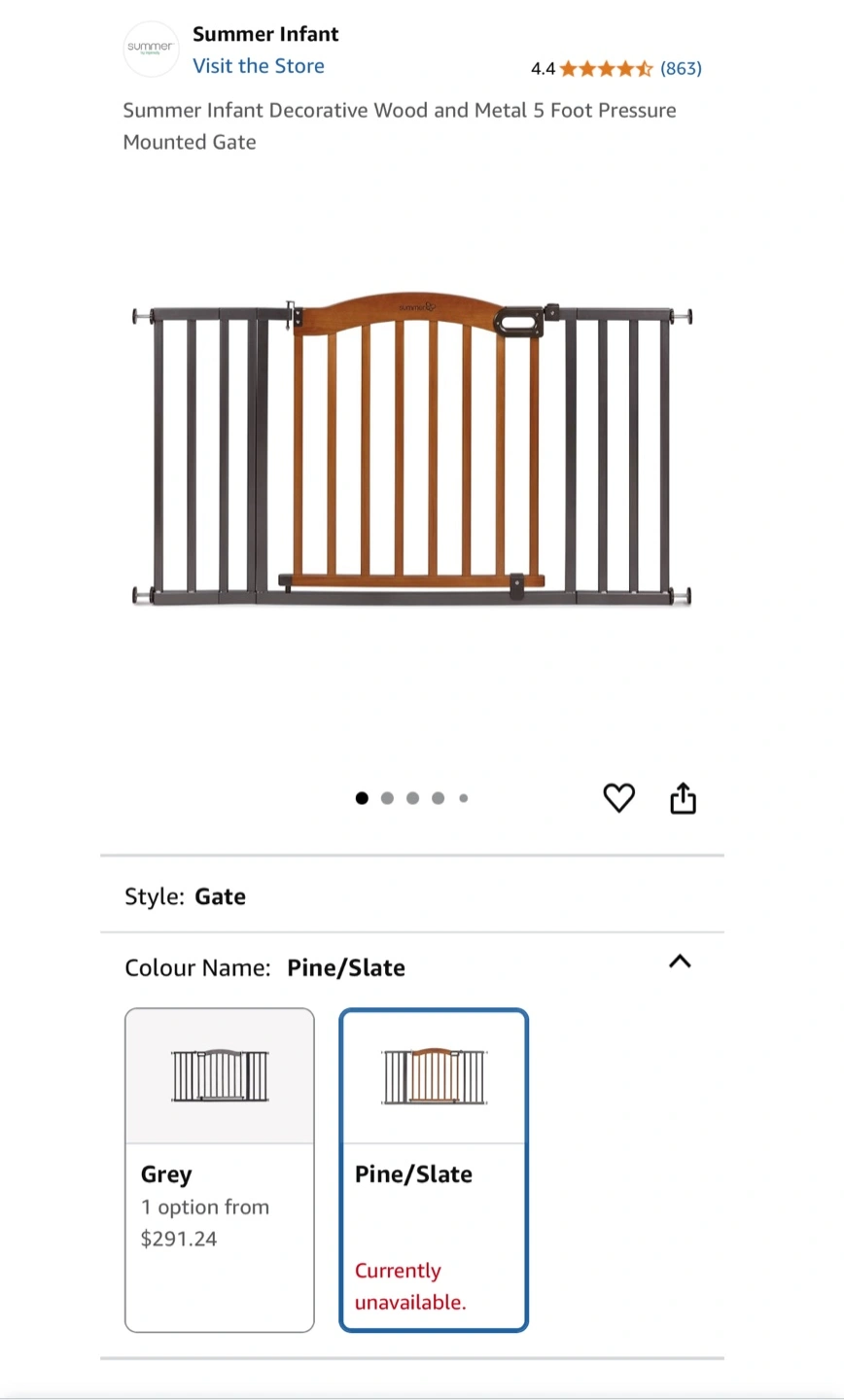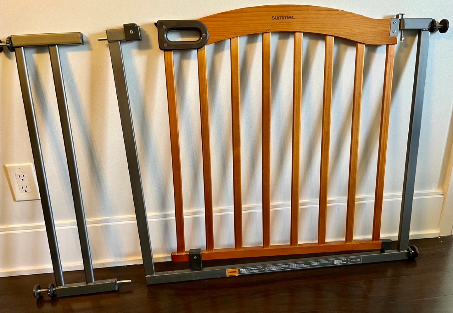 Selling a Summer Infant decorative wood and metal 5-foot pressure-mounted gate in pine/slate colour. It's in great condition and ready to keep your little one safe! Perfect for doorways or hallways