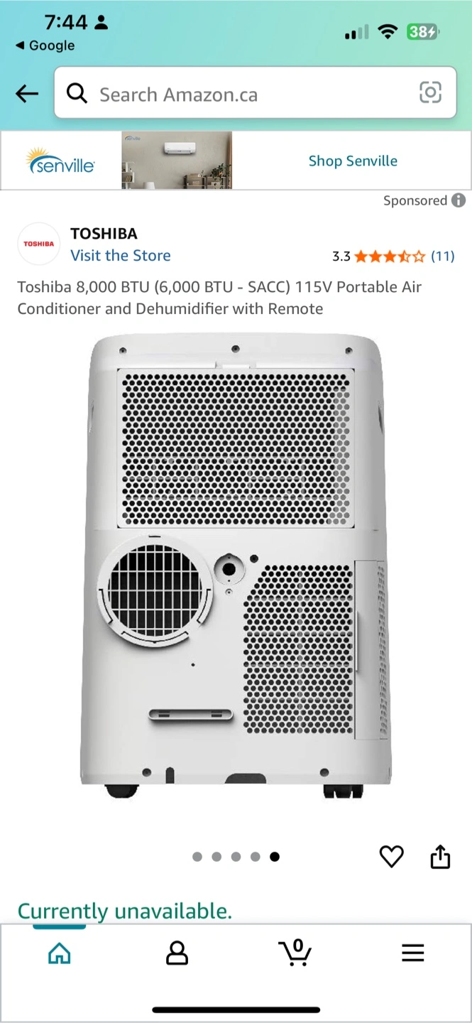 Selling a Toshiba 8,000 BTU (6,000 BTU - SACC) 115V Portable Air Conditioner and Dehumidifier. It's in great working condition and ready to keep you cool!