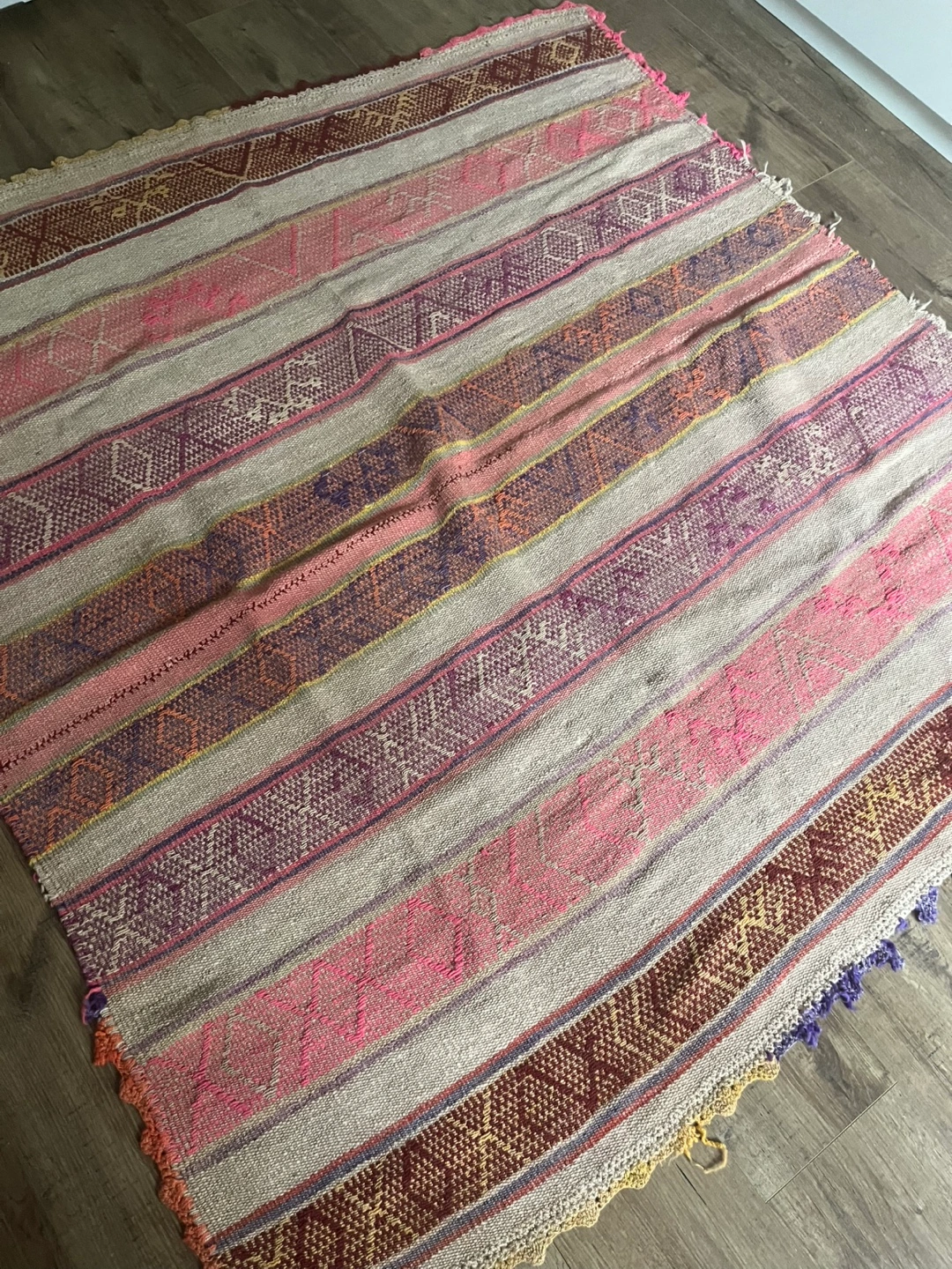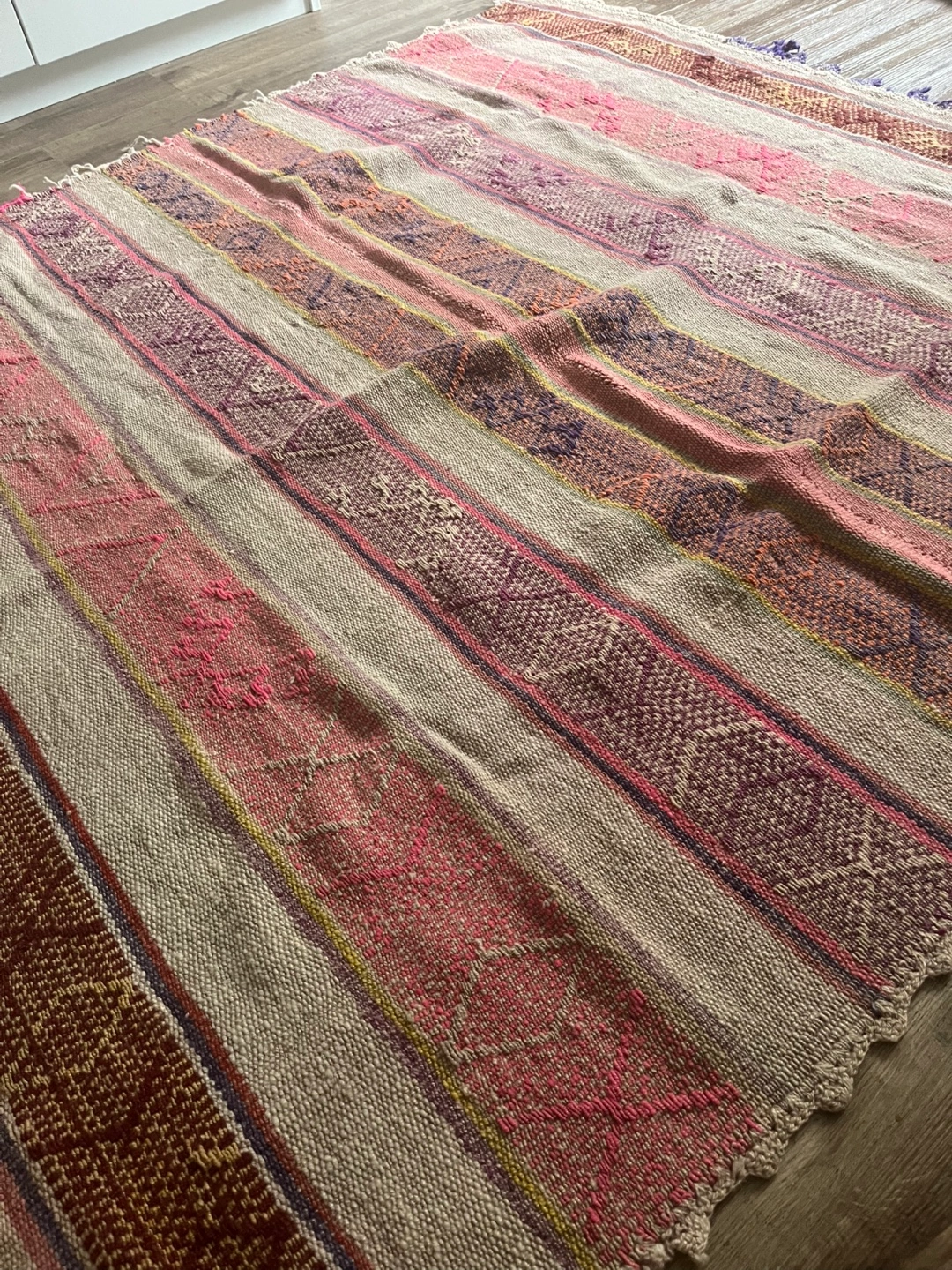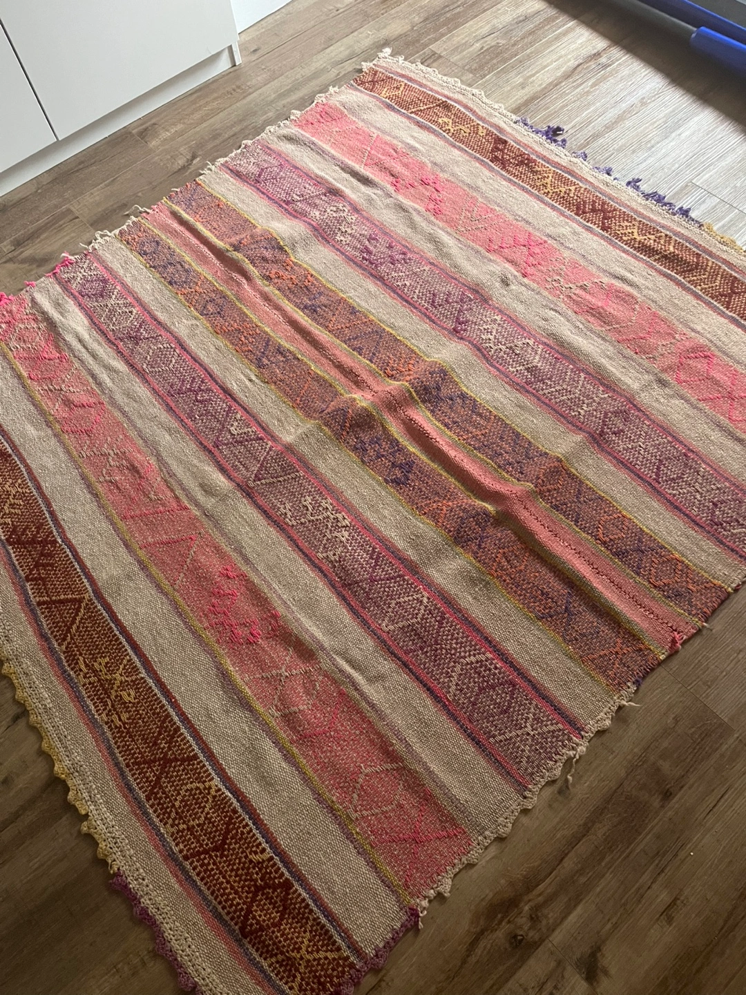 Selling a lovely striped throw blanket! It measures approximately 54 inches by 60 inches. It has a beautiful woven pattern with a mix of pink, brown, and beige stripes. Perfect for adding a touch of warmth and style to your home