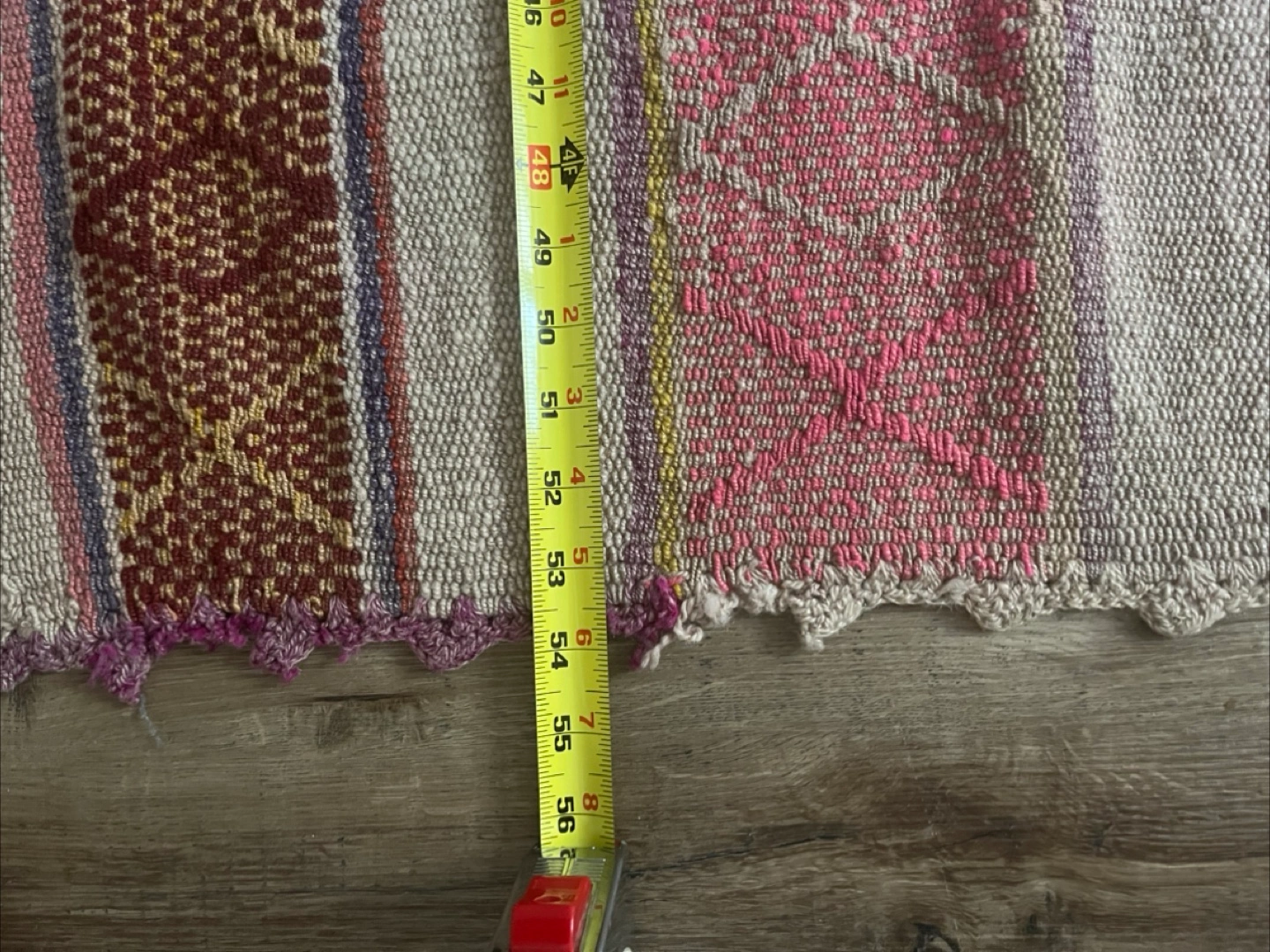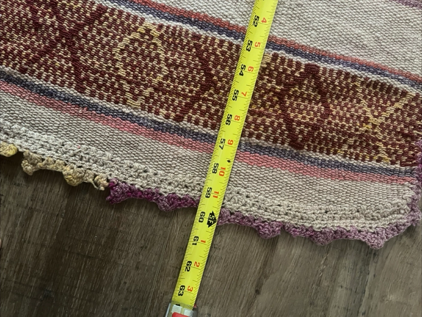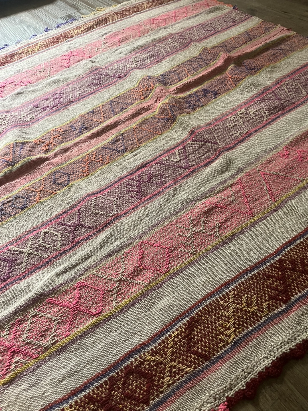 Selling a lovely striped throw blanket! It measures approximately 54 inches by 60 inches. It has a beautiful woven pattern with a mix of pink, brown, and beige stripes. Perfect for adding a touch of warmth and style to your home