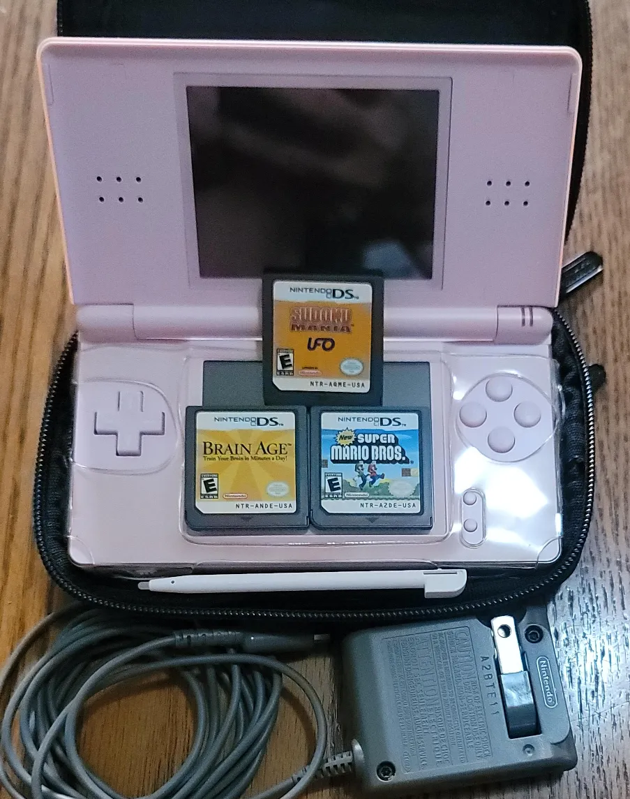 Selling a cute pink Nintendo DS! It comes with a few games: Sudoku Mania UFO, Brain Age, and New Super Mario Bros. Also included is the stylus and charger! $55 I will not be lowering the price anymore