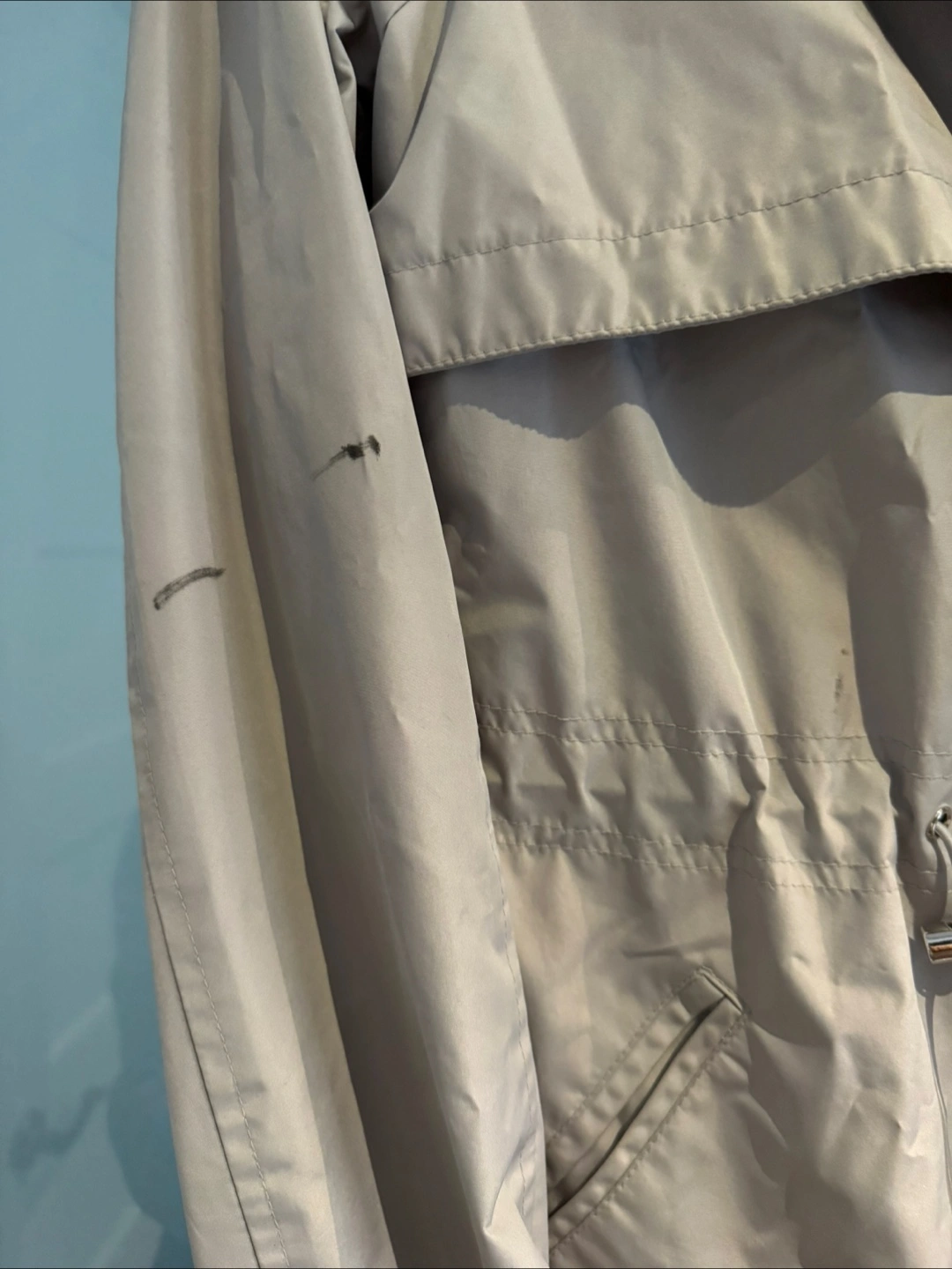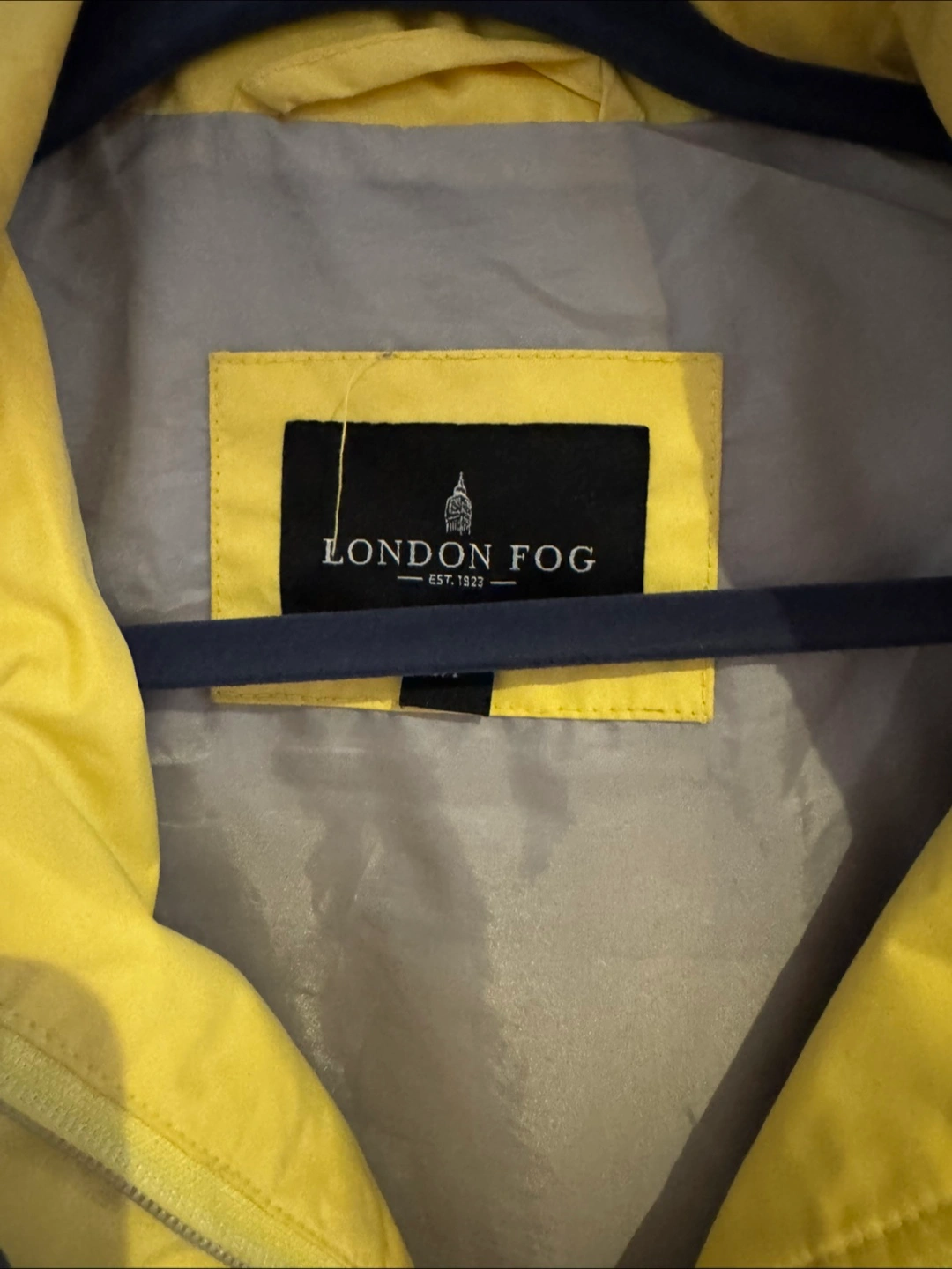 Selling a London Fog jacket. It's a light gray colour with a yellow hood lining. The jacket has a couple of marks on the right sleeve and right chest.