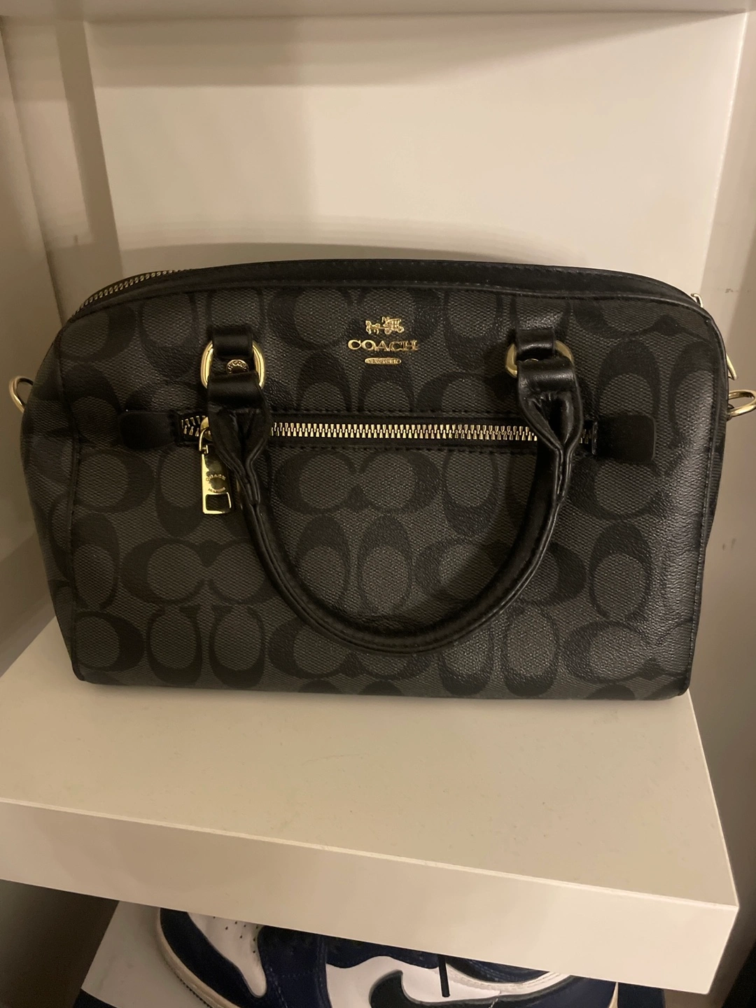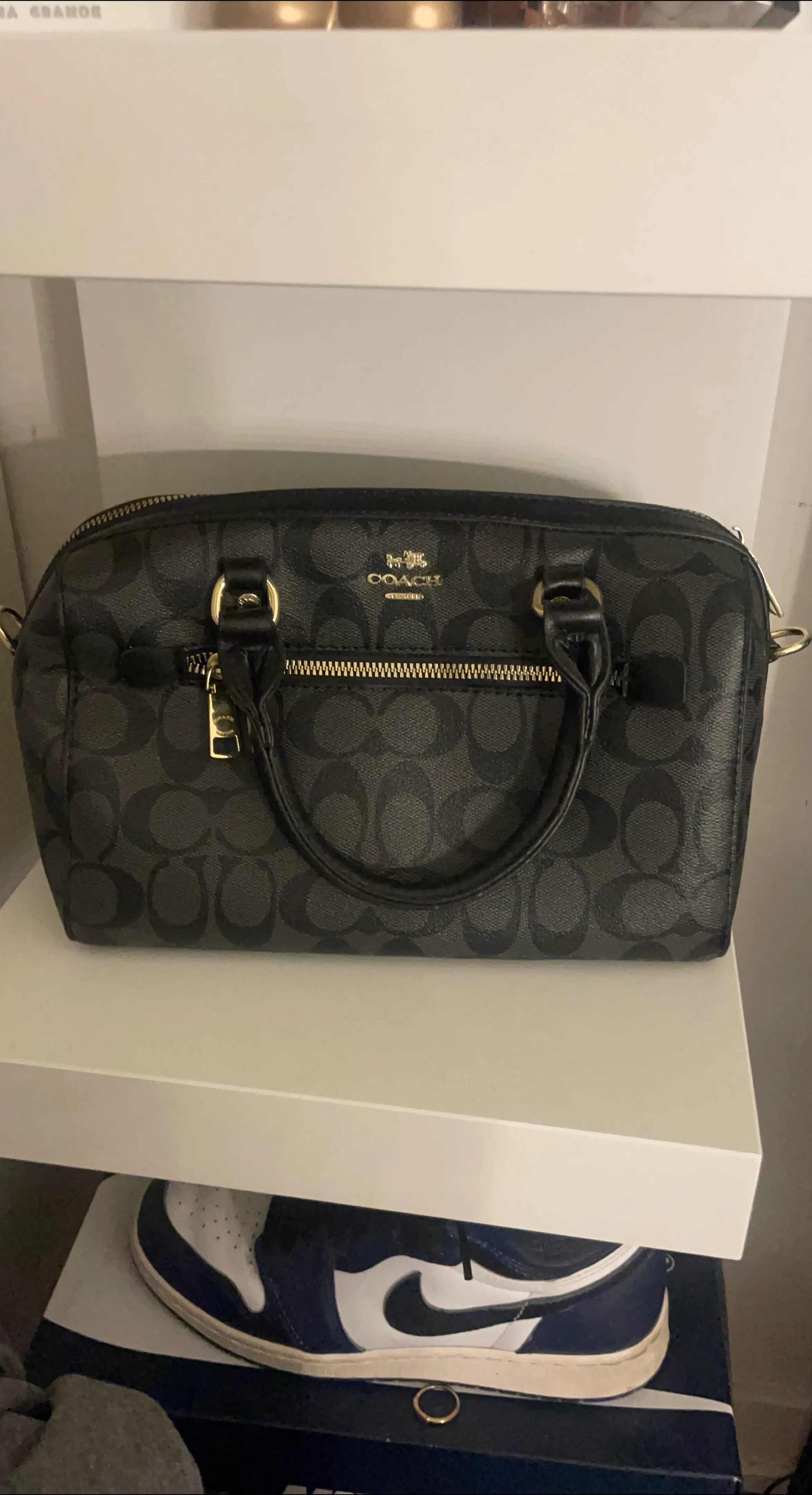 Selling a stylish Coach satchel in a black and grey monogrammed design! It's in great shape and perfect for everyday use. The bag features gold-tone hardware and a convenient top handle.