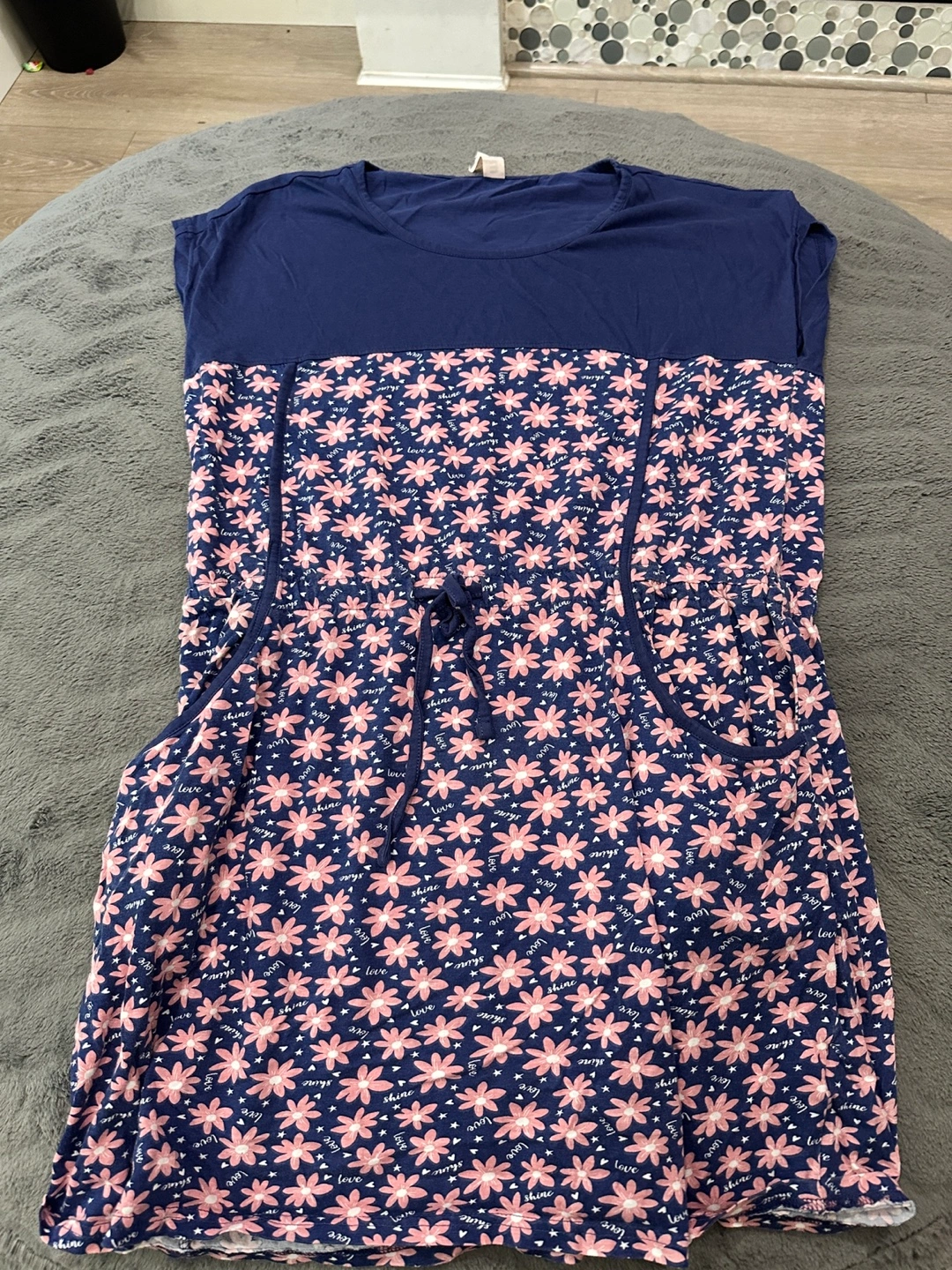 Cute navy dress with a pink floral print! It's in great condition and perfect for warmer weather. Has a drawstring waist and handy pockets too