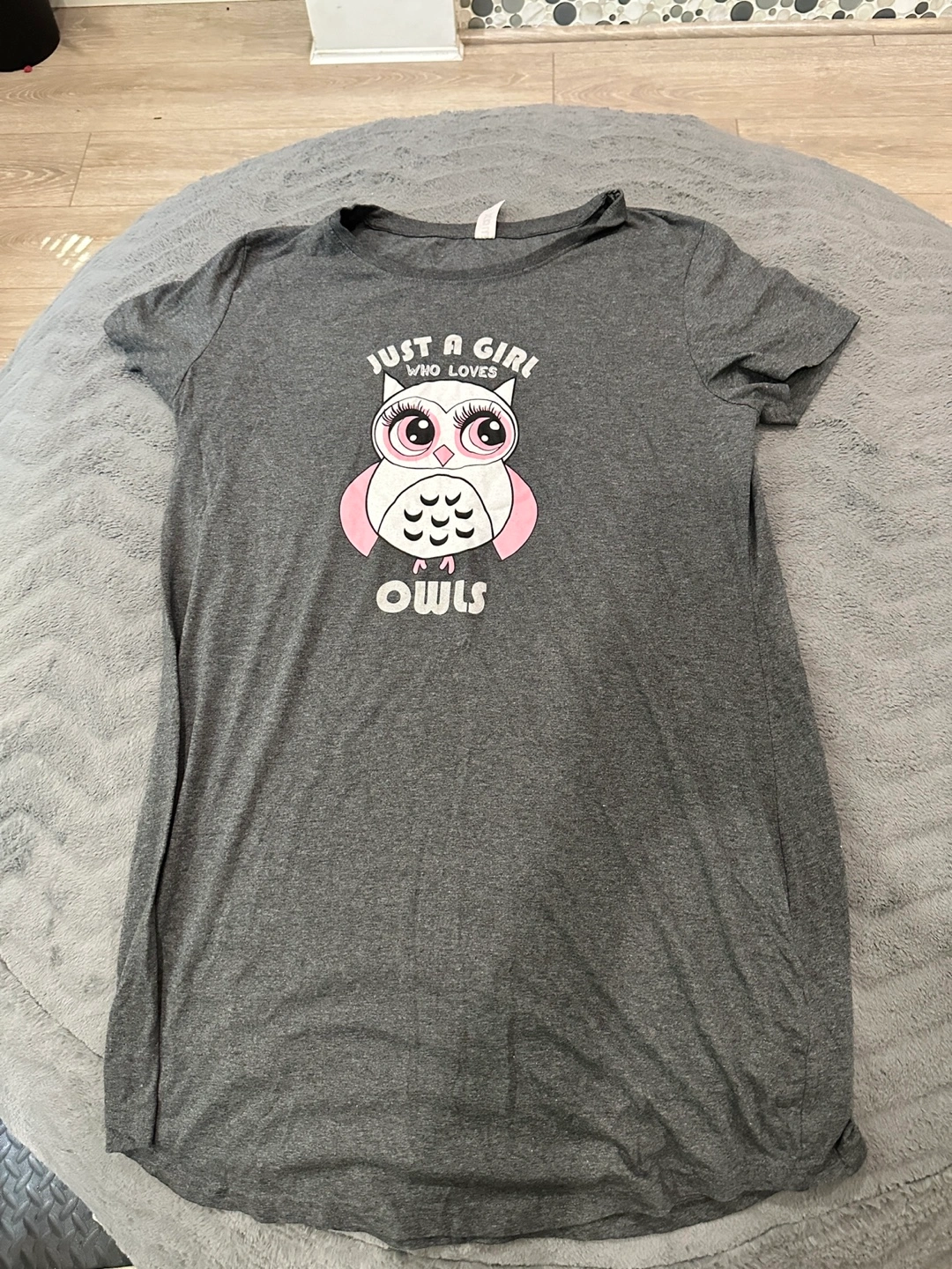 Cute grey t-shirt with an owl graphic that says 'Just a girl who loves owls'! It's in great condition and ready for a new home