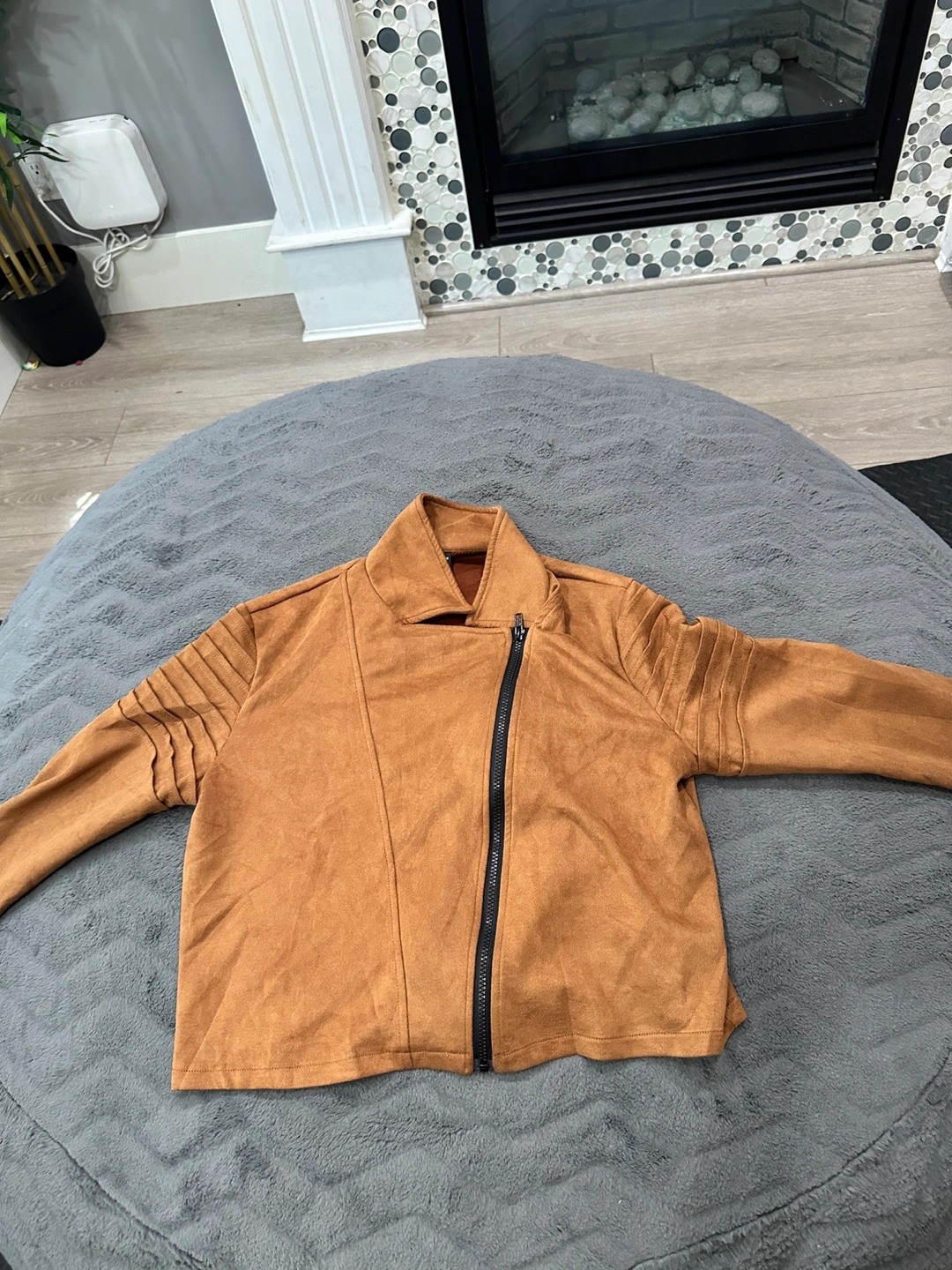 Here's a stylish brown suede moto jacket! It features an asymmetrical zipper and a unique design on the sleeves. Perfect for adding a bit of edge to any outfit!