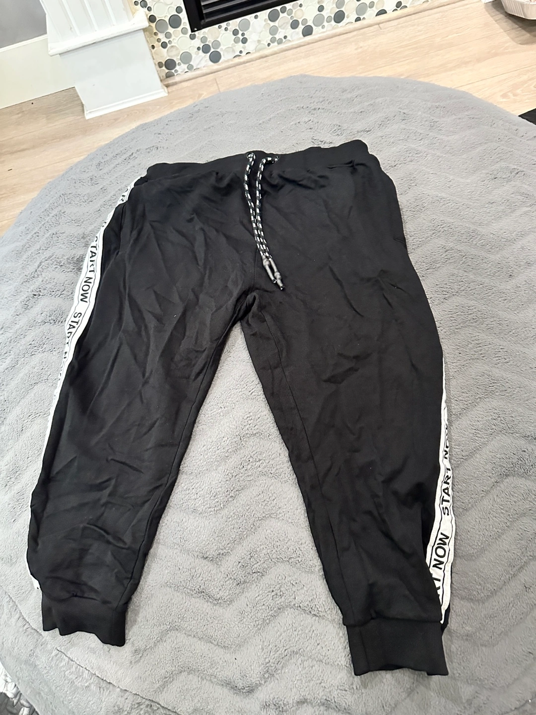 Selling a pair of black track pants with a unique 'Start Now' stripe down the side. They're in great condition and super comfy for lounging or hitting the gym!