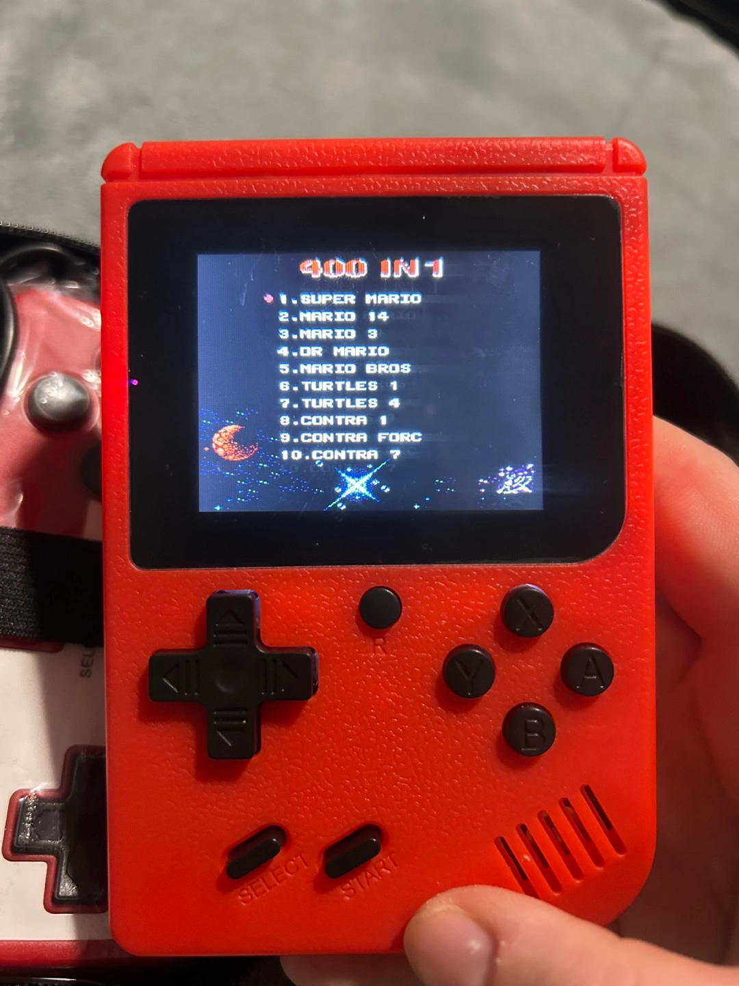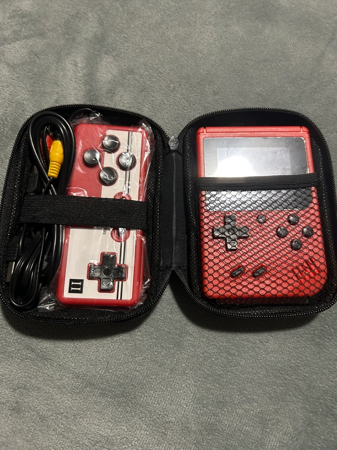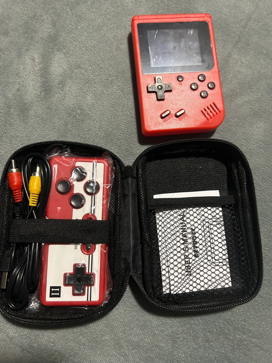 Selling a fun red handheld game console with 400 games built in! It comes with a case, AV cables, a charging cable, and a user manual