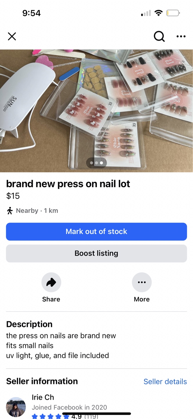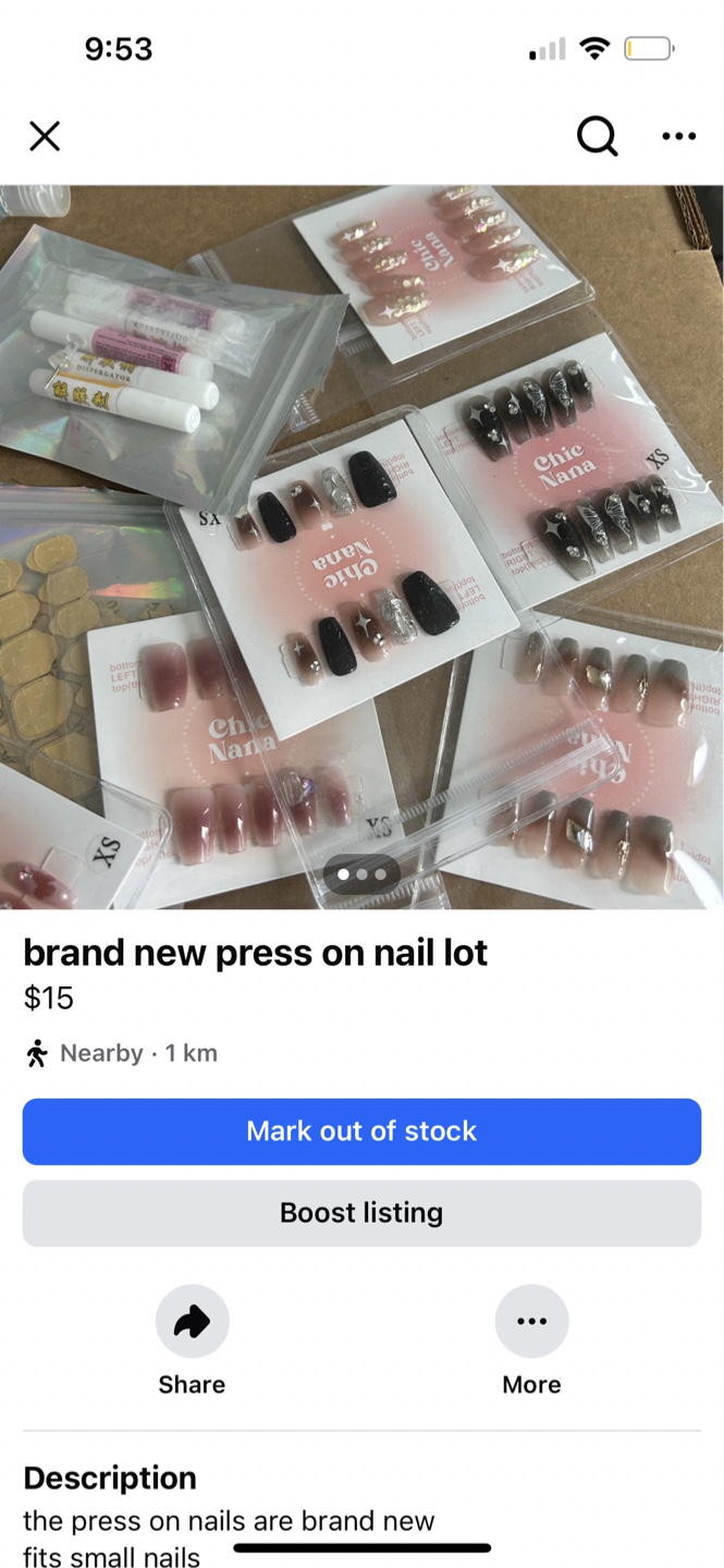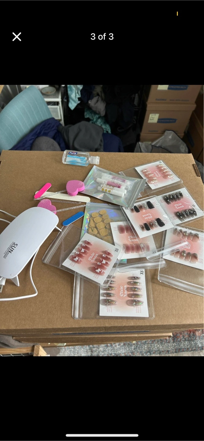 I'm selling a brand new set of Chic Nana press on nails! They are brand new and fit small nails. UV light, glue, and file are included!