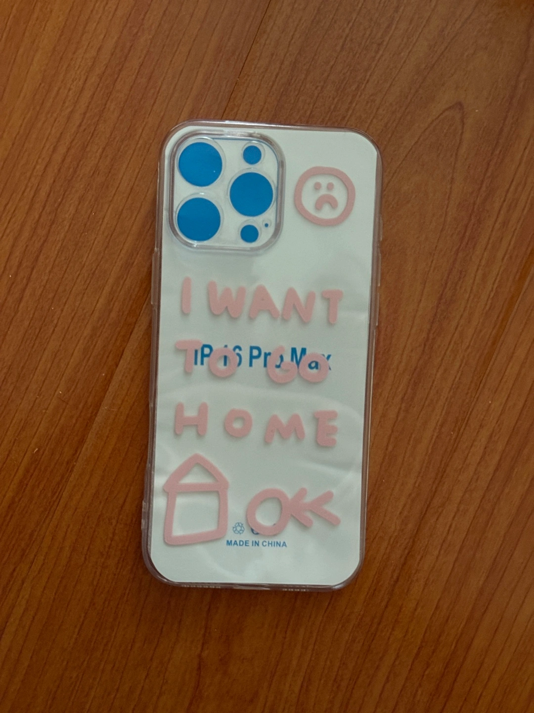 Cute iPhone Pro Max case with a clear design and pink accents. It says 'I want to go home' with a little house and an 'OK' symbol. Perfect for adding a touch of personality to your phone!
