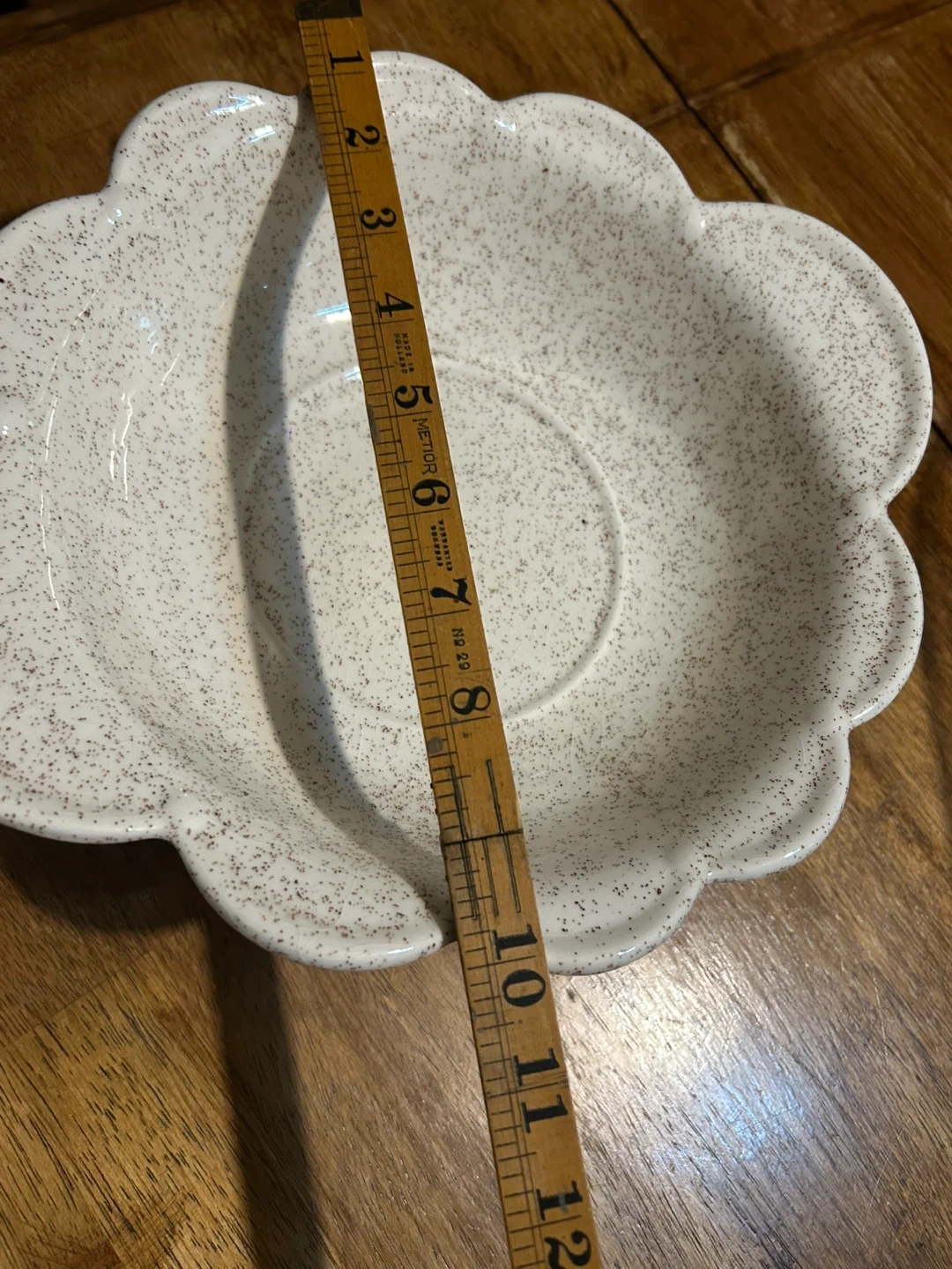 Vintage ceramic pitcher and wash bowl set with a speckled design. The pitcher stands approximately 8 inches tall and the bowl has a diameter of about 11 inches. It's a classic wash basin set.