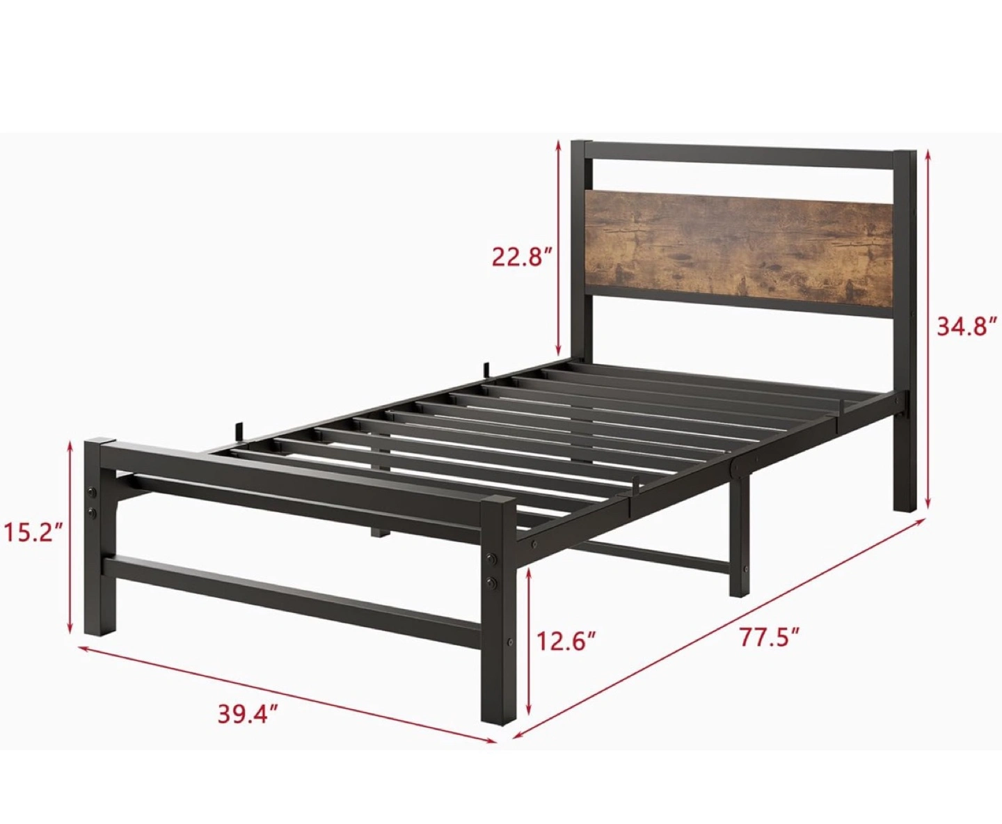 Selling a twin-size metal bed frame with a headboard! It's in great shape and ready for a new home. The frame is black metal with a wood-look headboard. Dimensions are approximately 77.5" long, 39.4" wide, and 34.8" high. Perfect for a small space or a kid's room
