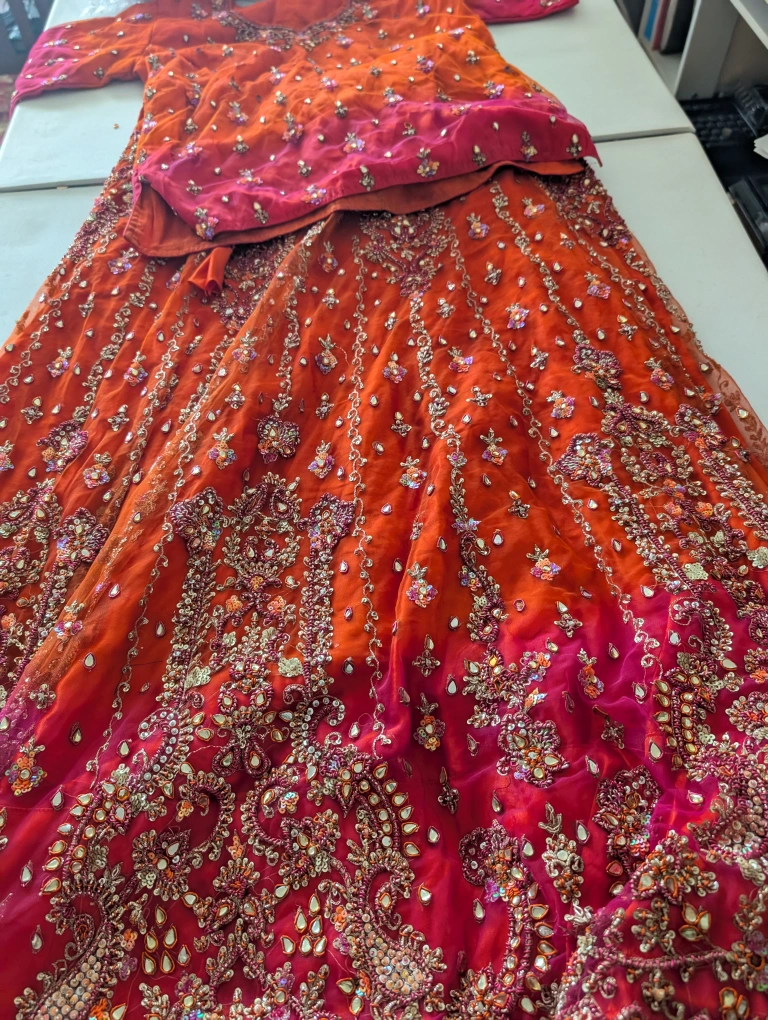 Beautiful orange and pink lehenga choli with intricate embroidery. Perfect for a special occasion!