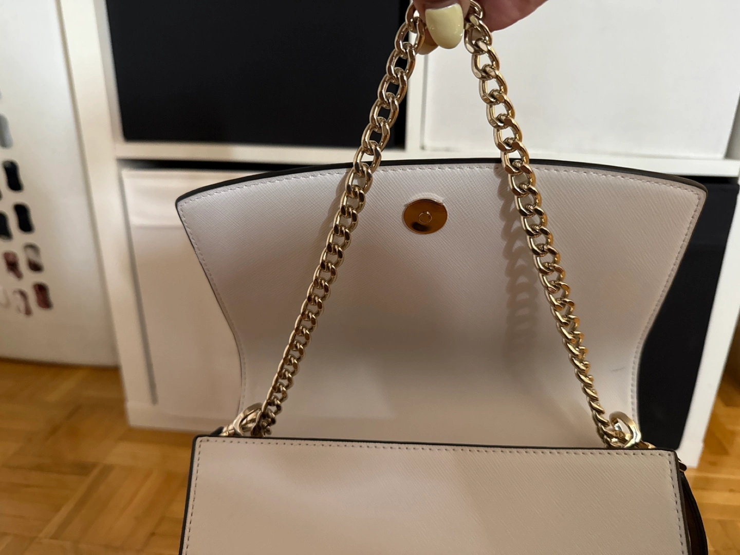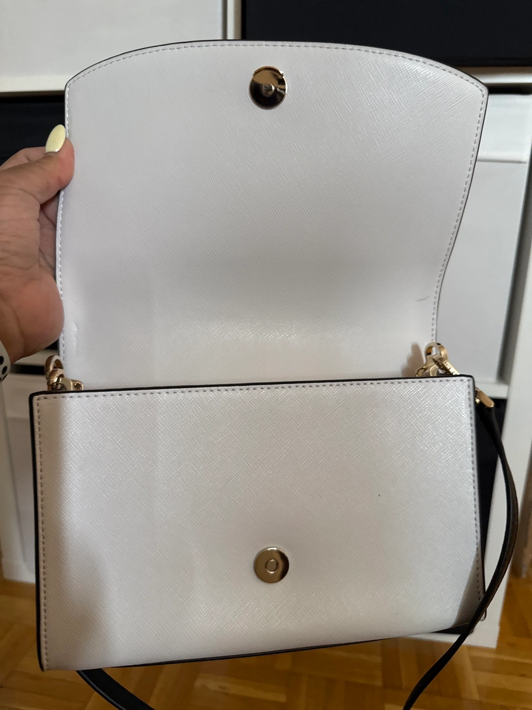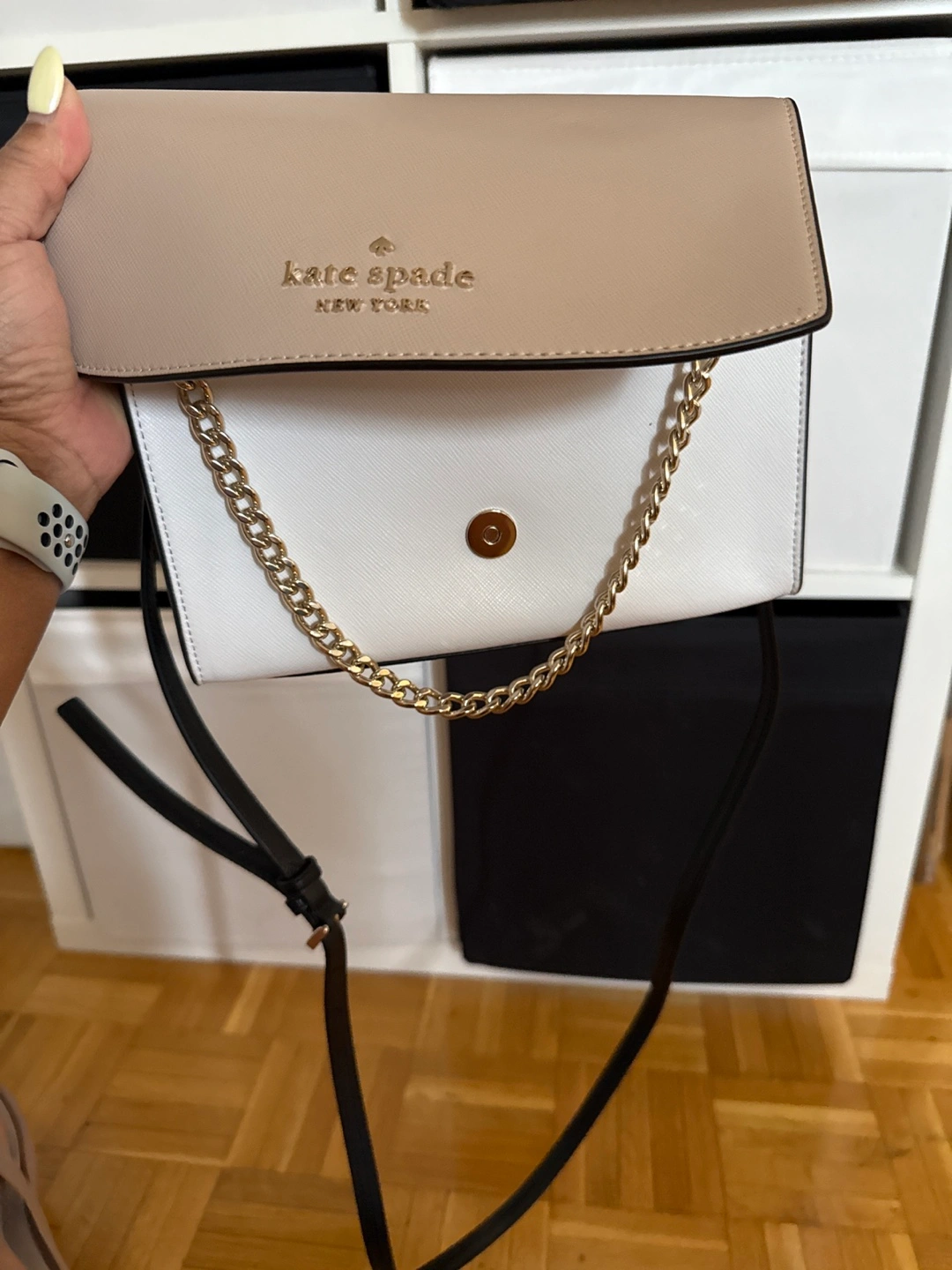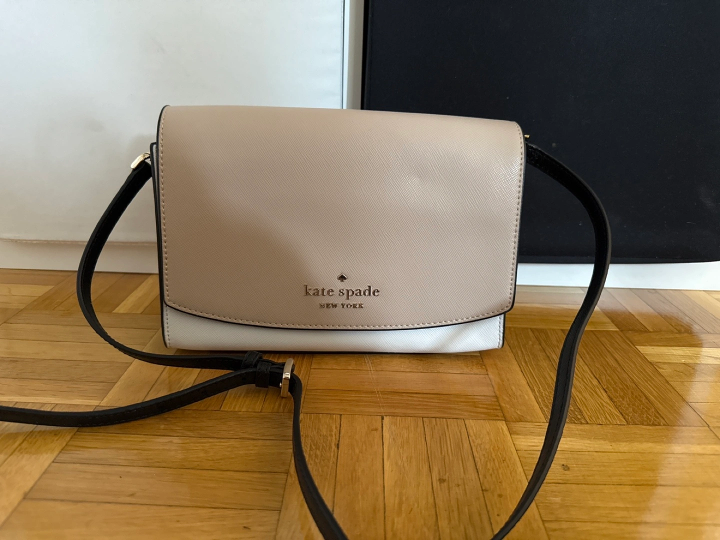 Selling a cute Kate Spade crossbody bag in a lovely beige and white colour combination! It's in great condition and perfect for everyday use. The bag features a black strap and a secure closure. Absolutely NO rip.