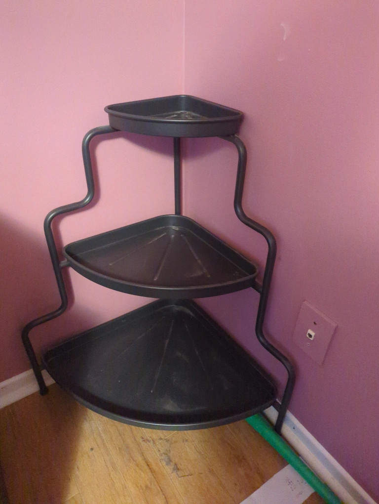 Selling a handy corner shelf with three tiers! It's in good condition and perfect for adding some extra storage in a small space. The black colour makes it easy to match with any decor. Great for plants, books, or anything you need to display