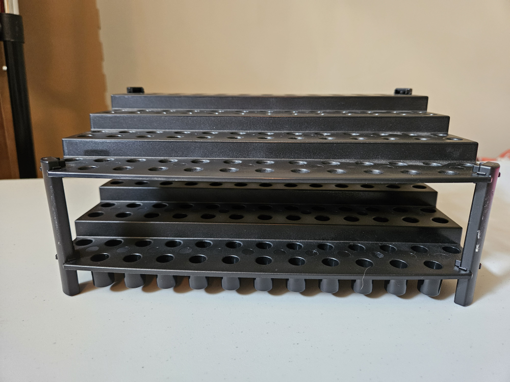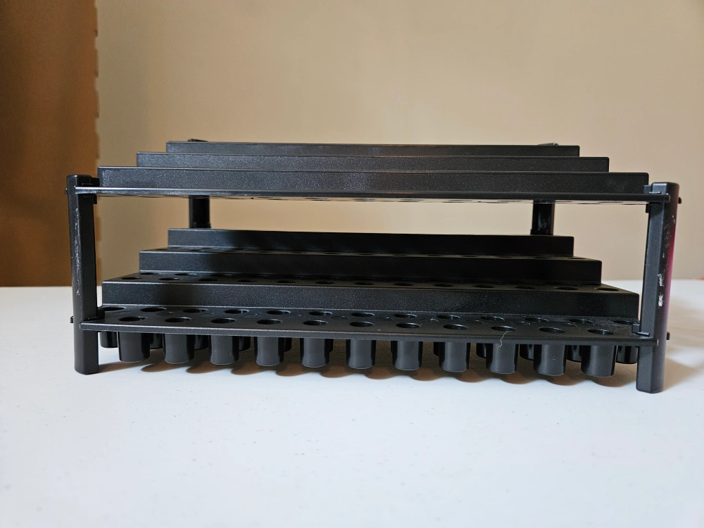This is a black gel-pen/pencil display shelf. It is in great condition and is perfect for displaying your art supplies or organizing your space. It's lightweight and easy to move around, making it a versatile addition to any room.