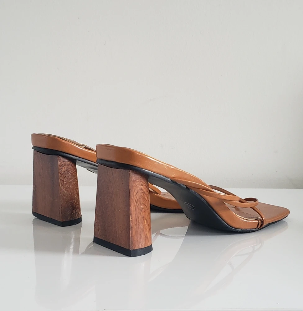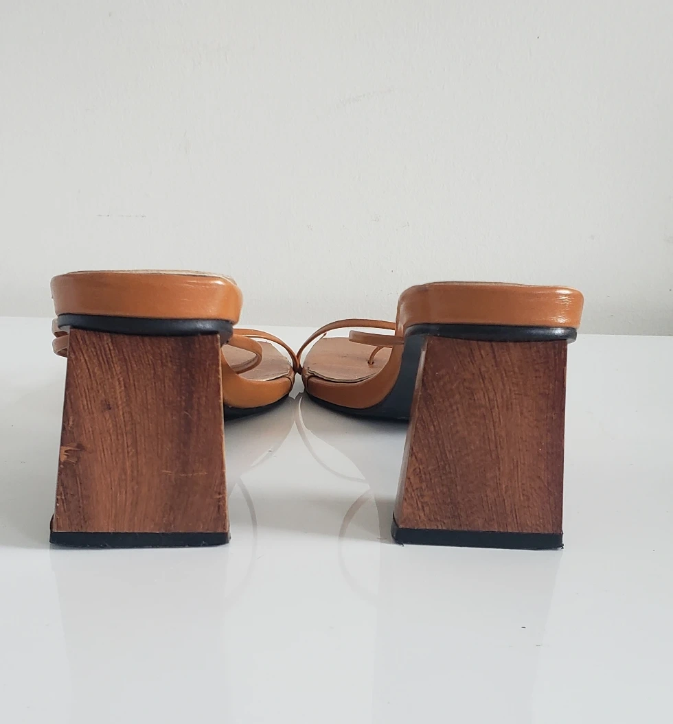 xiang fan leather sandals. GUC. some minor scuffs on perimeter around toe. statement wood block heel. labelled size 39 but im a 7 and these fit well. best fit: size 7-8.