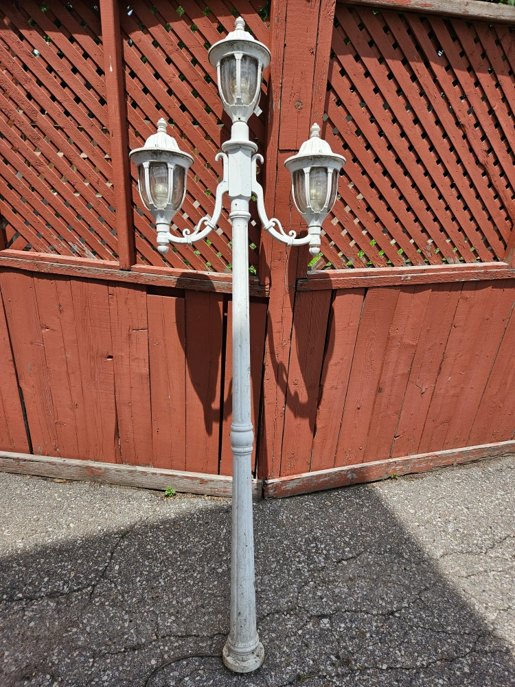 Here's an outdoor lamp post with three lights! It would be perfect for adding some charm to your yard or garden. It shows some signs of wear, but it's still in good working condition and ready to brighten up your outdoor space