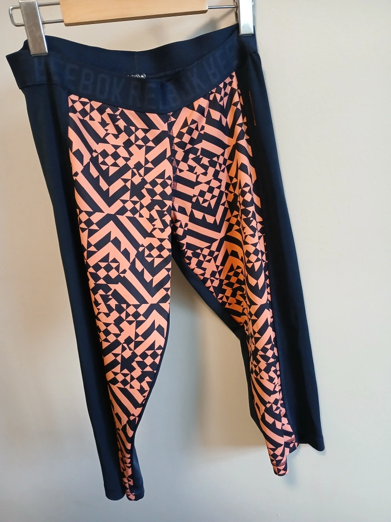 Cute Reebok leggings in a black and salmon geometric pattern! These are perfect for workouts or just lounging around. They're in great condition and ready for a new home