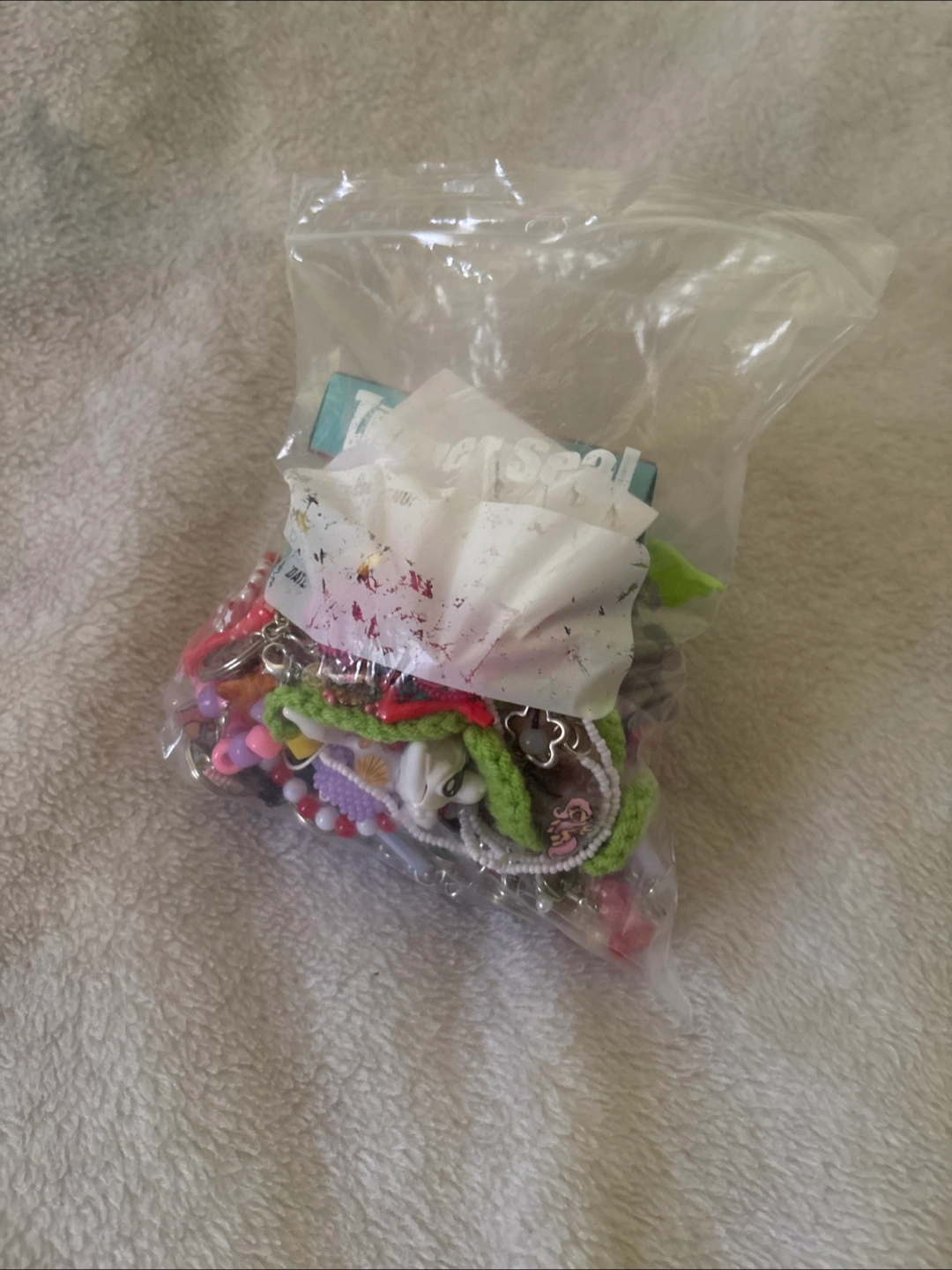 A bag of assorted craft supplies! Includes a variety of beads, charms, crochet pieces, a stamp, and earrings. Please contact to check the price