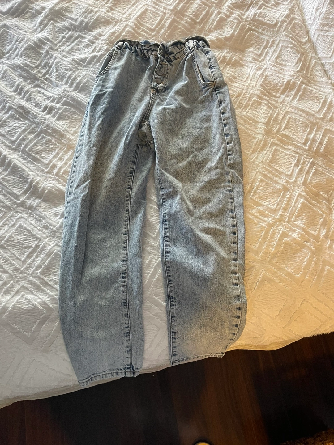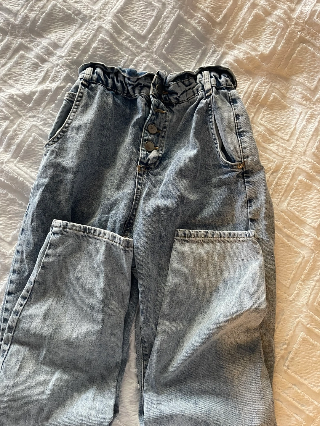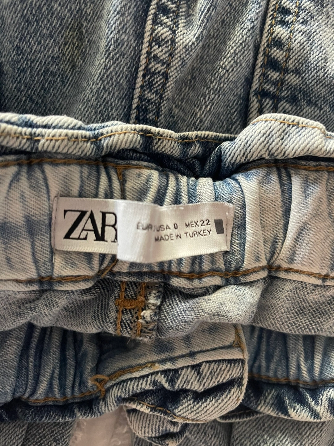 Selling a pair of Zara denim jeans with a paper bag waist. They are a light wash and in great condition. The size is EUR/USA 0 and MEX 22. Perfect for a casual, stylish look!